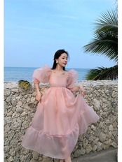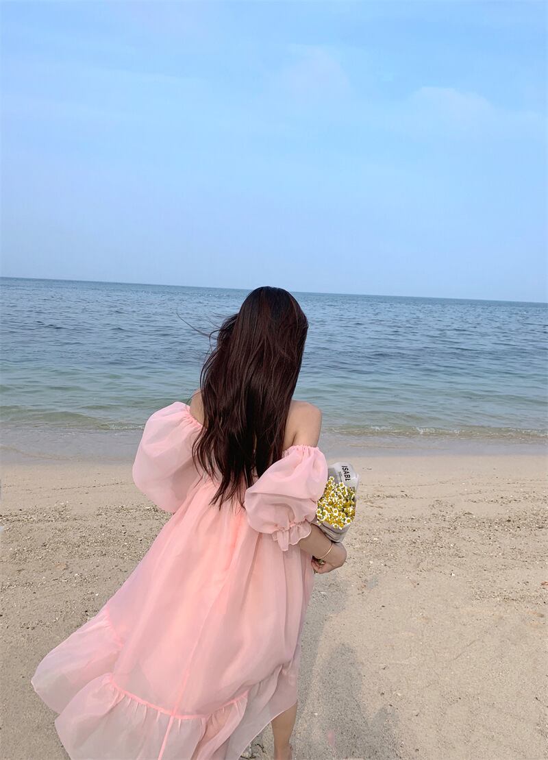夏フランス甘いピンクの妖精ドレス女性シックなスラッシュネックパフスリーブドレスセクシーなビーチメッシュ Vestidos 大人ガーリー スウィート キュート カジュアル サマー 夏物 bel41574590819