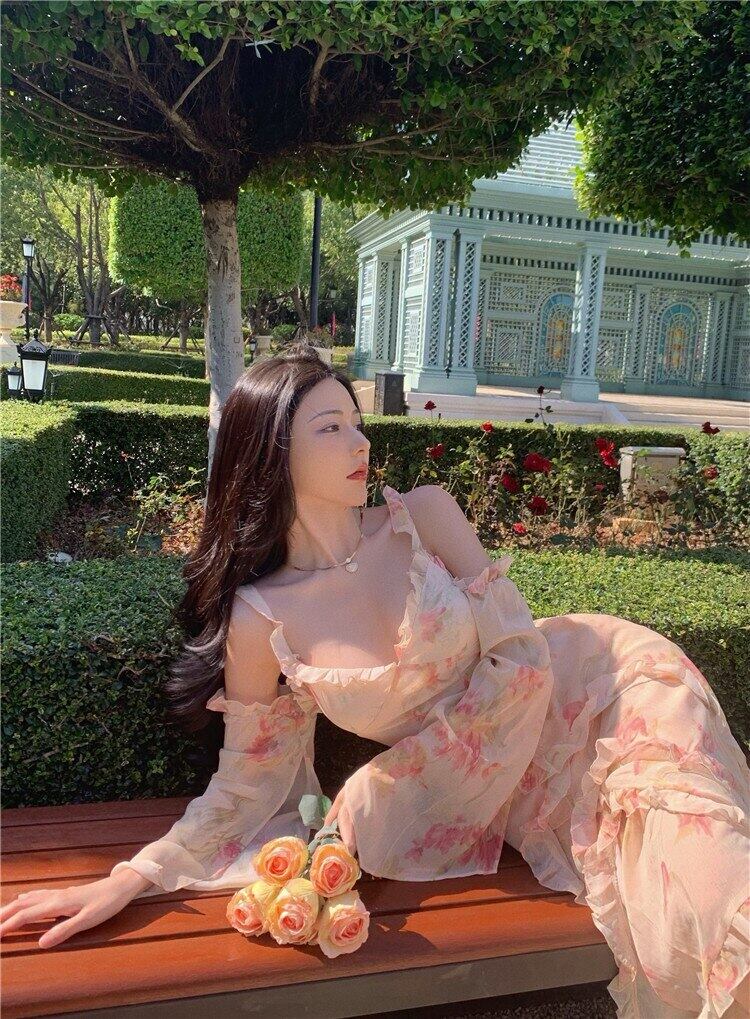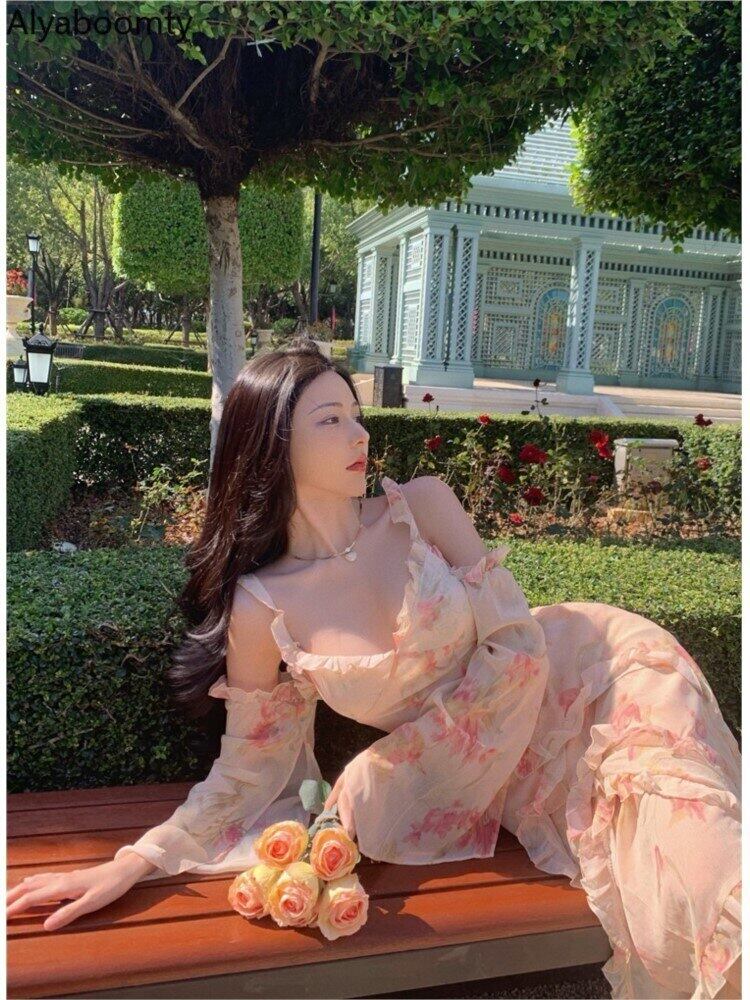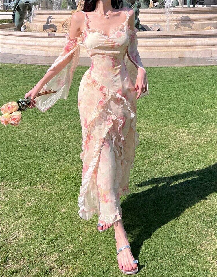 2022 夏の女性の花ロングドレスサスペンダー花フリルビーチ妖精ドレスノースリーブホリデーフレンチミディサンドレス ラッフル サマー 夏物 花柄 フラワーデザイン bel28233931380 | aliel