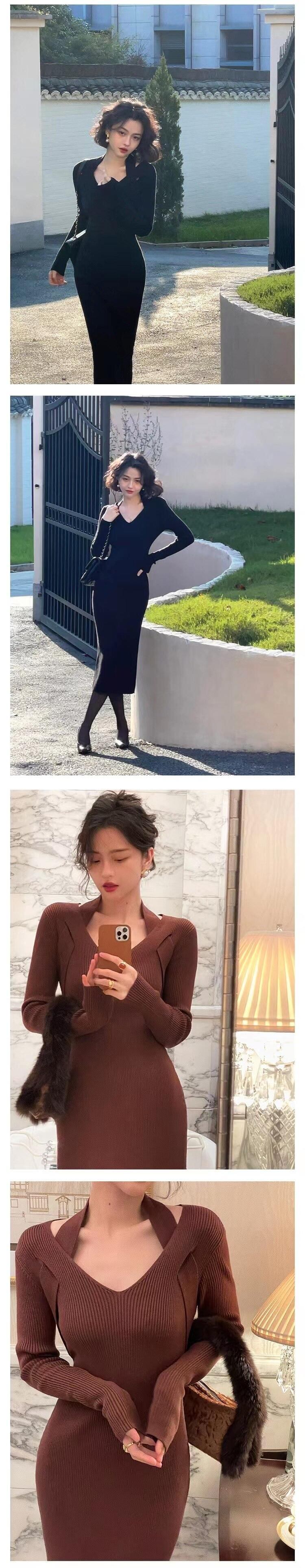 セクシーな秋タイトな V 長袖黒のセータードレス女性ボディコンスリム野生のレトロな Vestidos ソリッドニットスプリット ロング ブラック オータム 秋物 ソリッドカラー bel14903405272 | aliel
