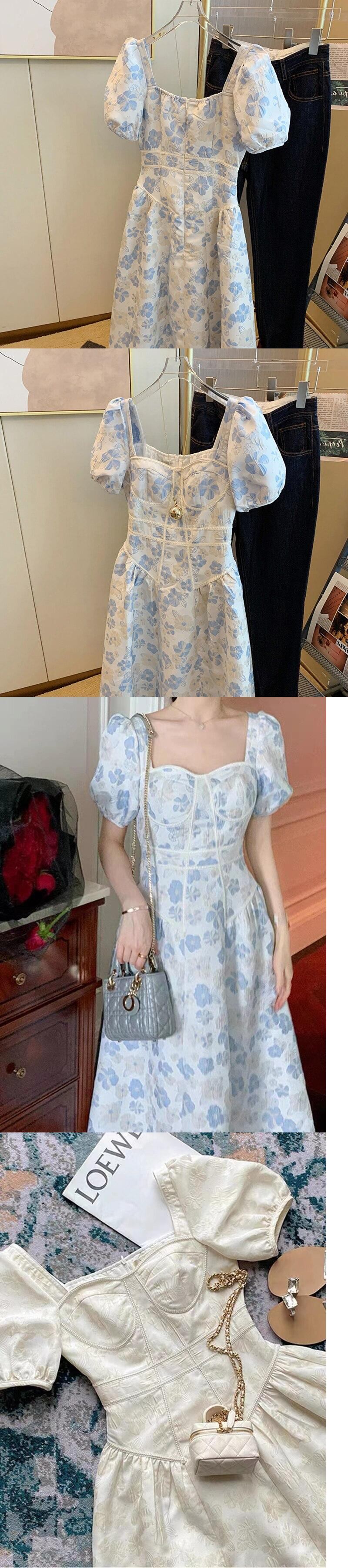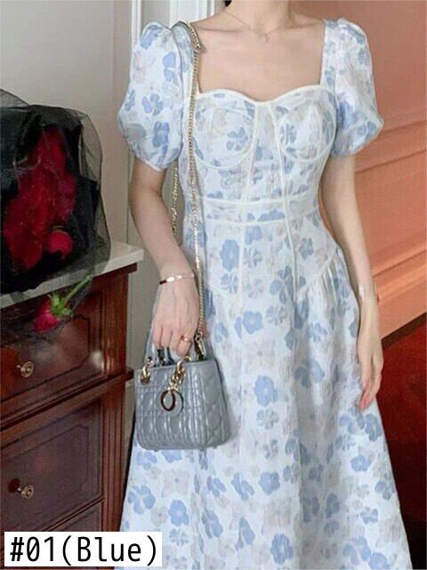 Vestido Floral de verano para mujer, vestido Midi de manga corta abombada con cuello cuadrado, cintura estilo corte Medieval 花柄 bel94033147758 | aliel