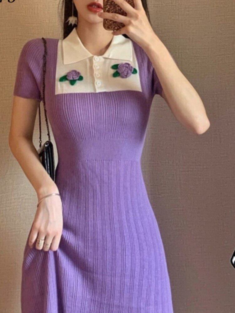夏紫ドレス女性スリムボディコンニットストレッチドレス花パッチセクシーな半袖ローブ Vestidos ショート ハーフスリーブ サマー 夏物 花柄 パープル bel70429802948 | aliel