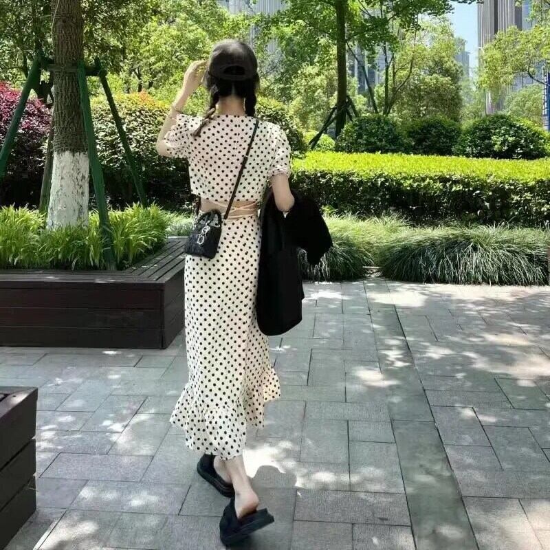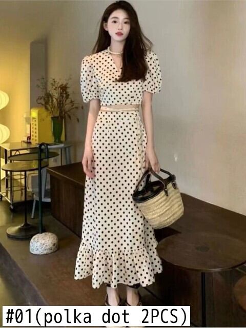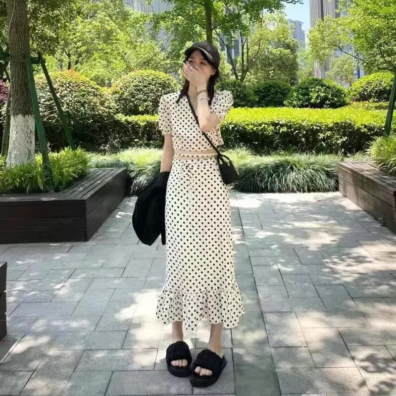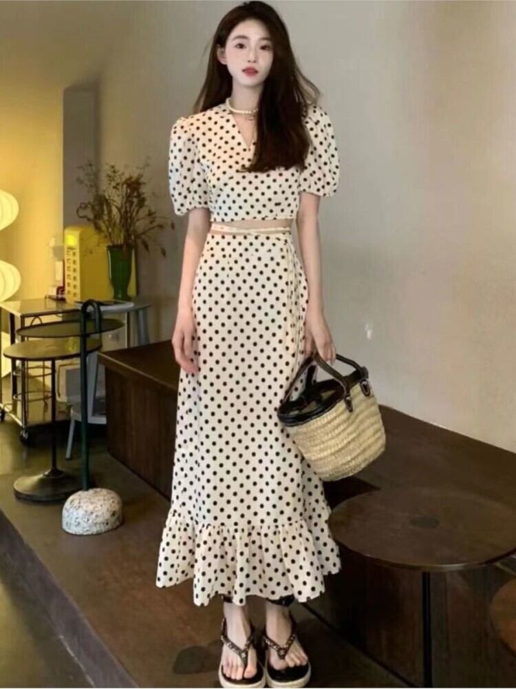 夏シックなスウィートポルカドットプリントスカートセット V ネックパフスリーブベルトクロップトップス + スリムパッケージヒップトランペットスカート女性スーツ 大人ガーリー キュート カジュアル サマー 夏物 ハーネス Vネック bel12885285776 | aliel