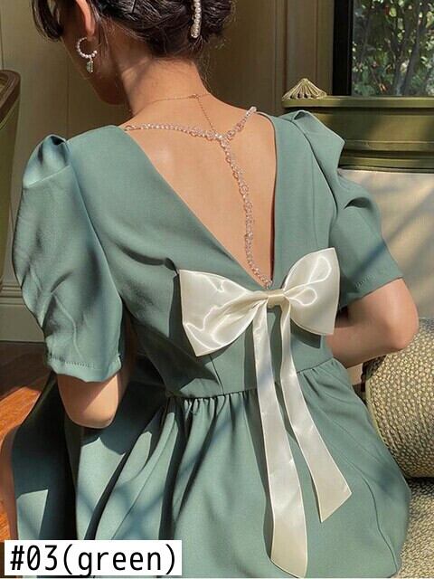 サマーボウドレス女性かわいいショートパフスリーブバックレスドレスホリデーパーティーグリーンドレス リボン 大人ガーリー スウィート キュート カジュアル 夏物 bel46367805586 | aliel