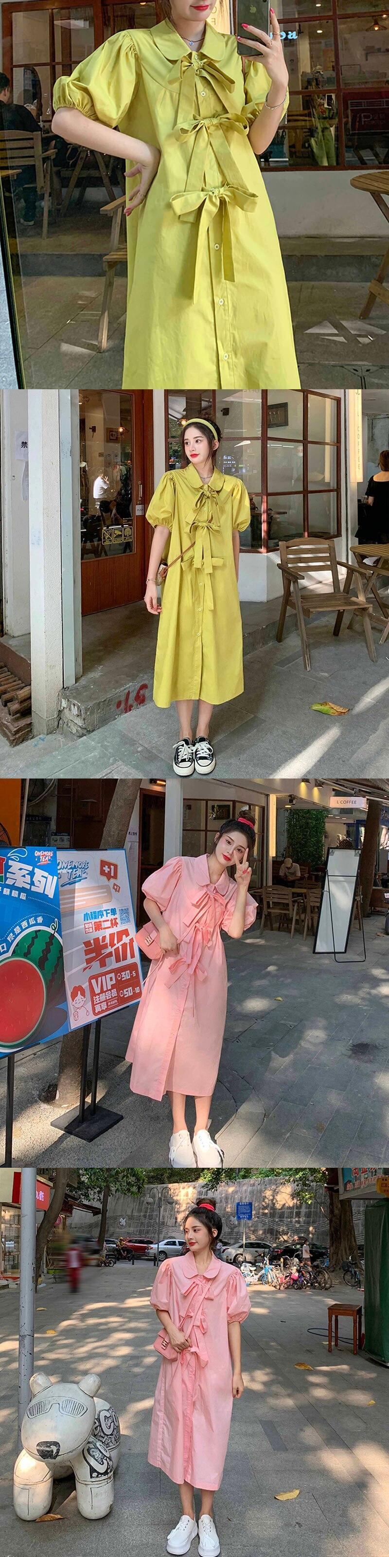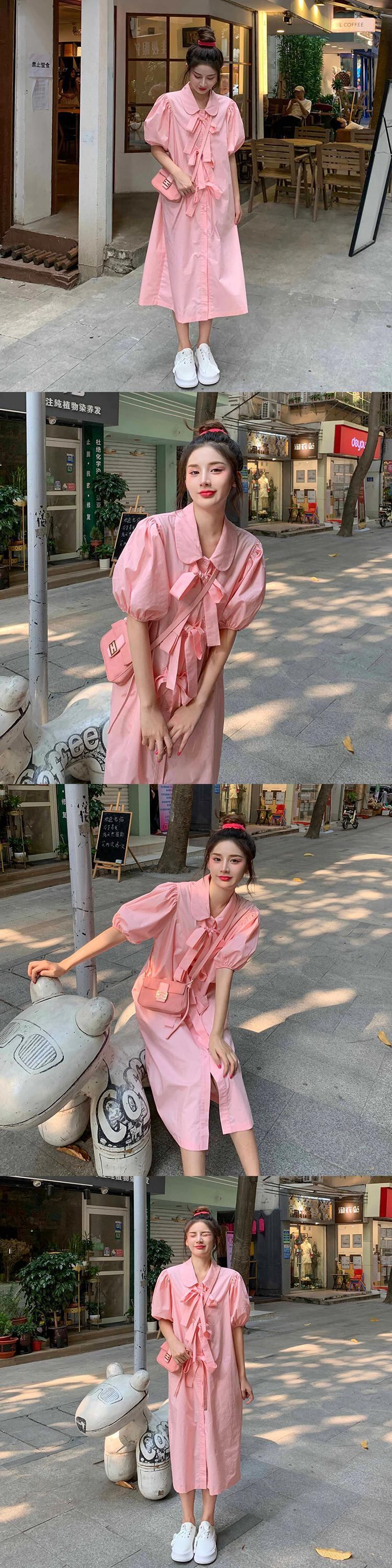 プレッピー スタイル スイート ガーリー ドレス レディース ルーズ シングルブレスト ドレス ボウ パフ スリーブ シャツ ドレス ロングドレス リボン 大人ガーリー スウィート キュート カジュアル bel21281022088 | aliel