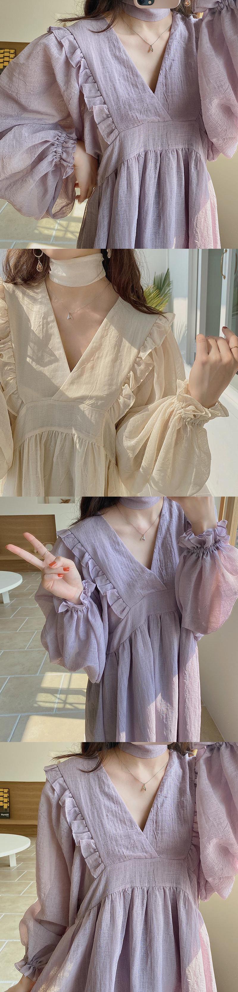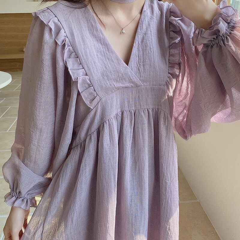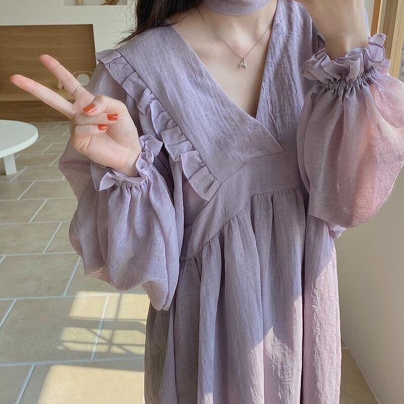 ドレス 無地 オルチャン レジャー プレッピースタイル パープル スウィートガール シフォン 夏 Vネック レトロ バギー ルーズ マキシ 大人ガーリー キュート カジュアル サマー 夏物 ソリッドカラー bel10673189256 | aliel