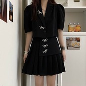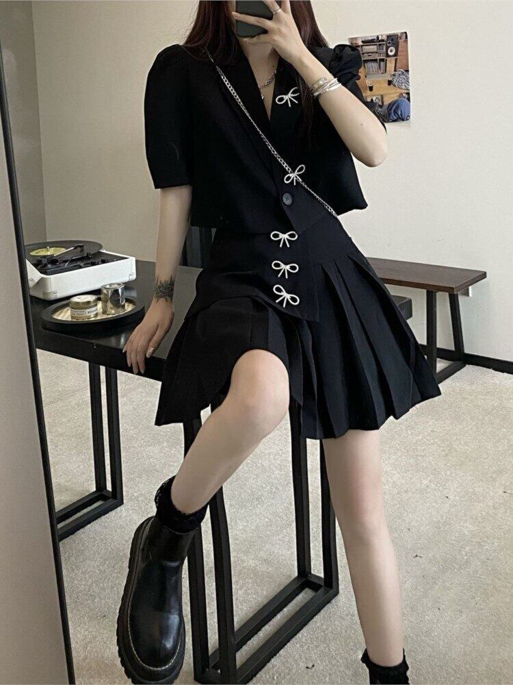 無地 2 ピース ミニ スカート セット 2022 半袖蝶ネクタイ ブラウス + プリーツ スカート スーツ ストリート ブラック セット ショート リボン ハーフスリーブ ソリッドカラー bel65193868652 | aliel
