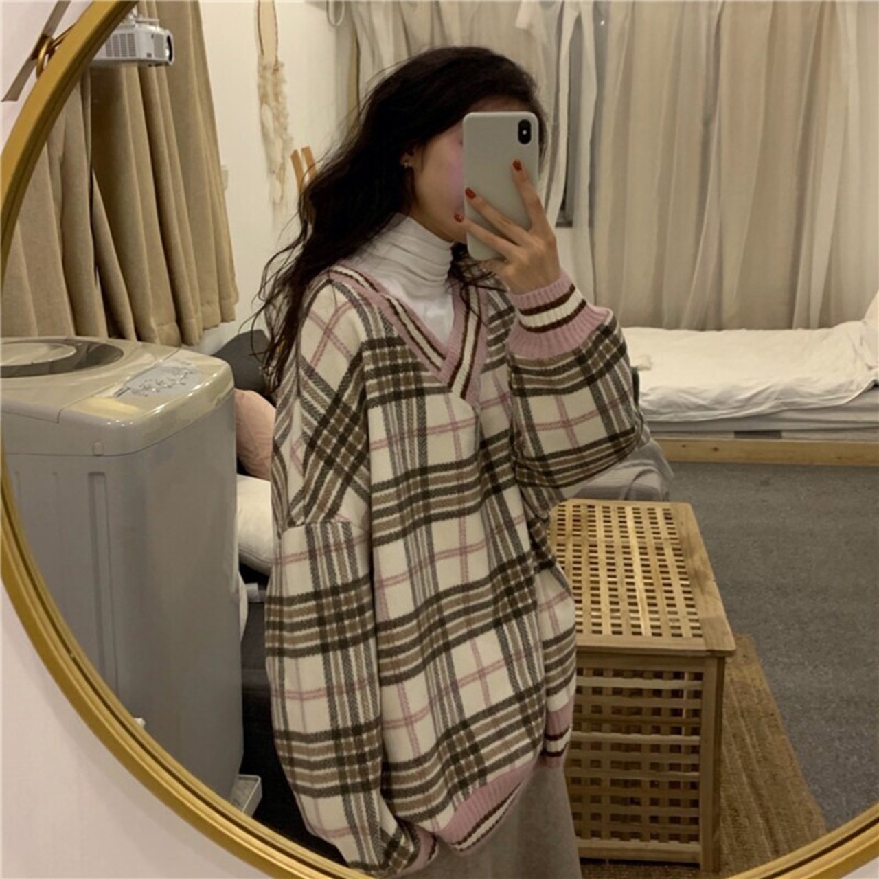 冬のルーズシックなチェック柄秋のVネックトップスIns Harajuku BF Simple Hedging Sweatershirt かわいい オータム 秋物 ウィンター 冬物 bel27916988778 | aliel