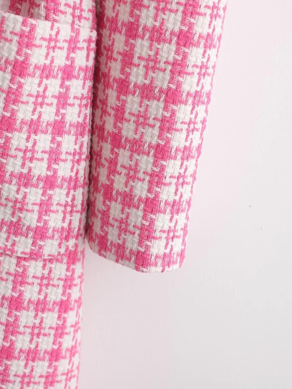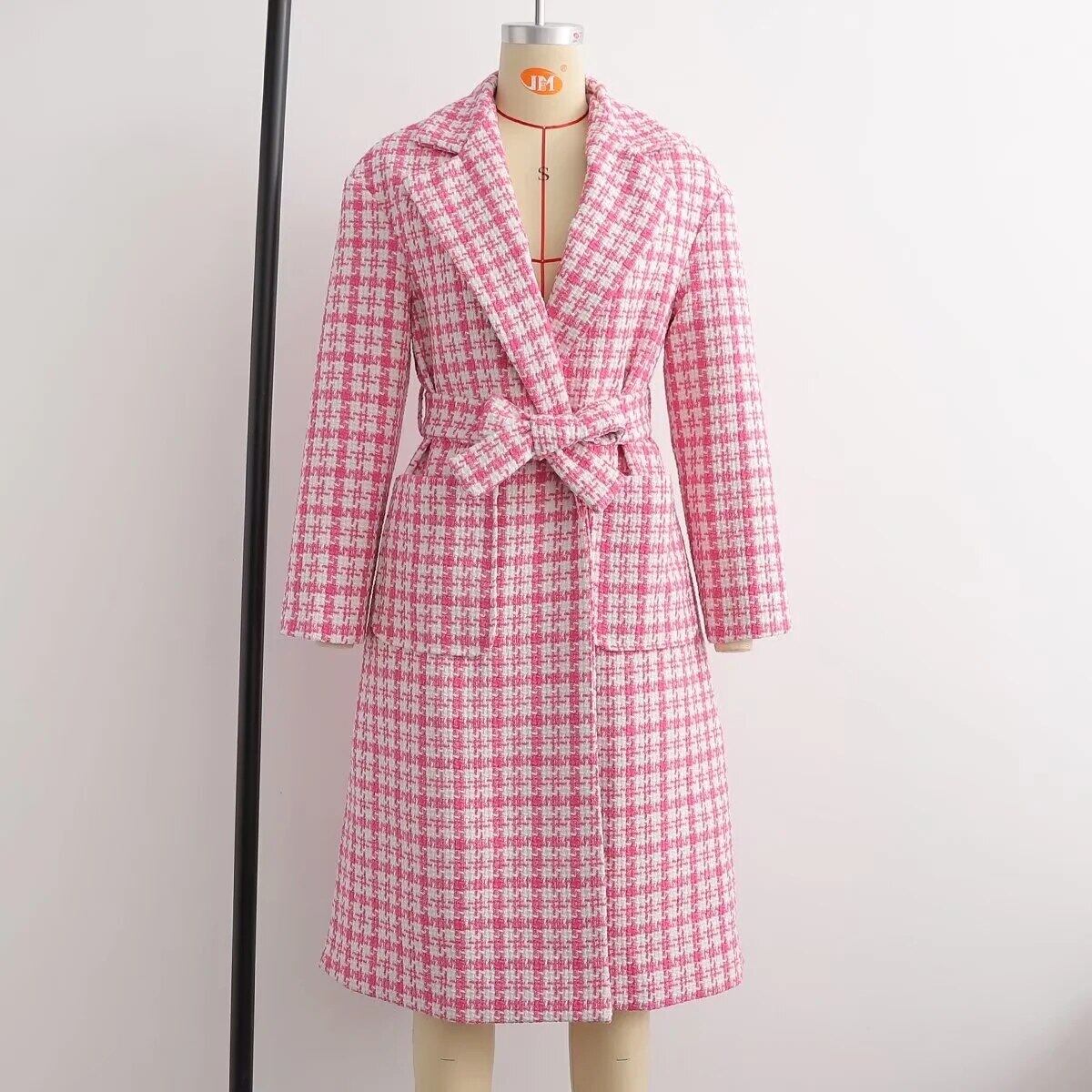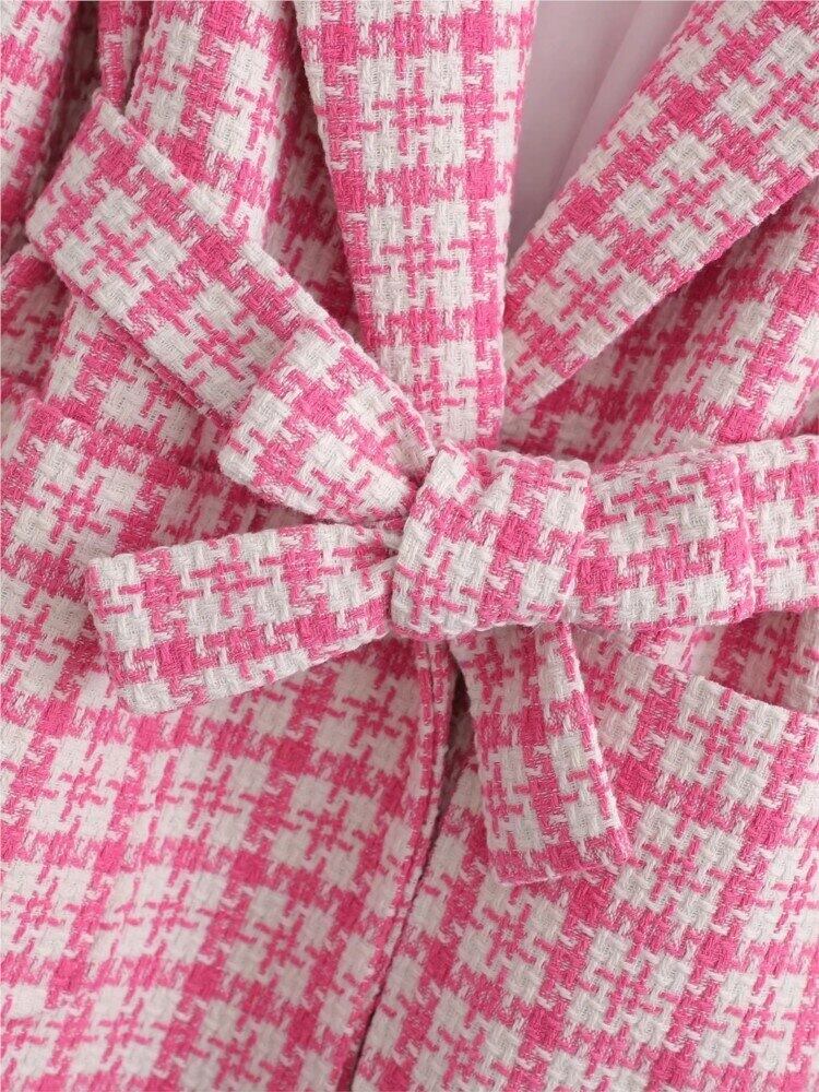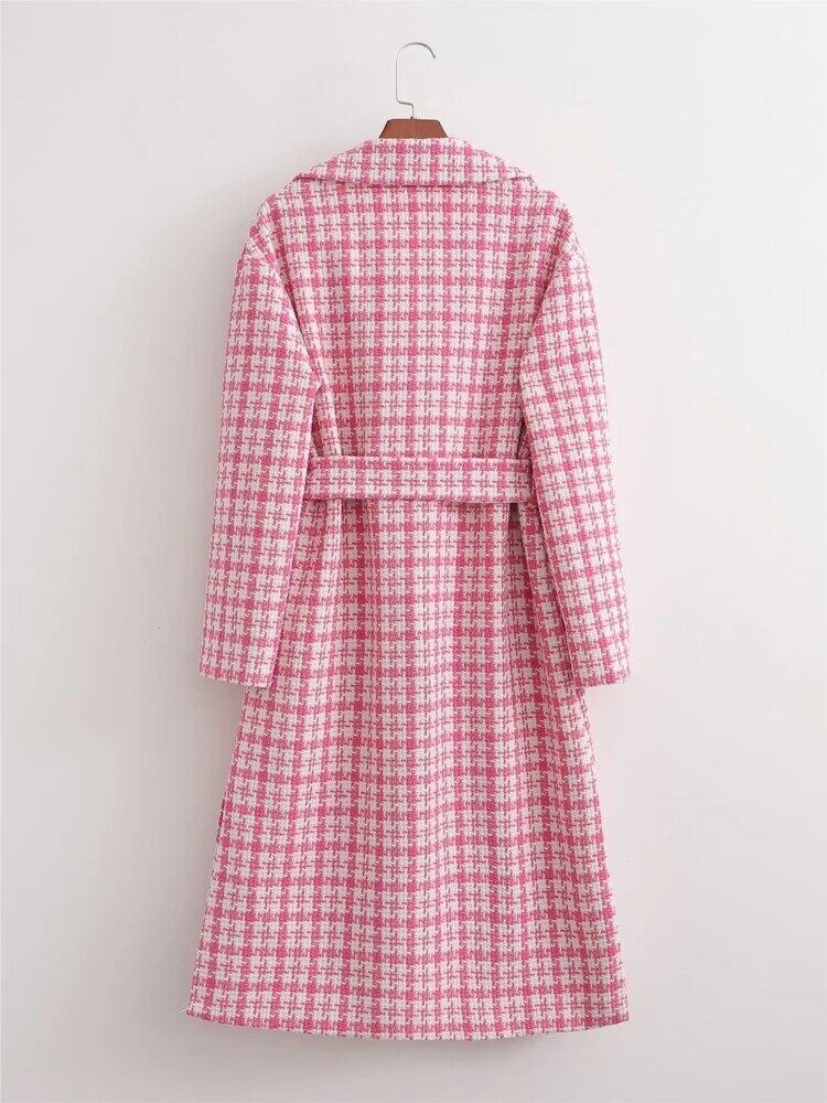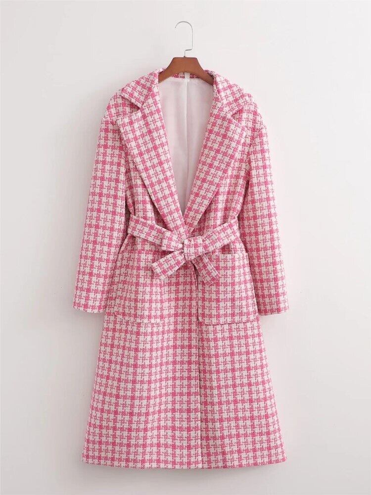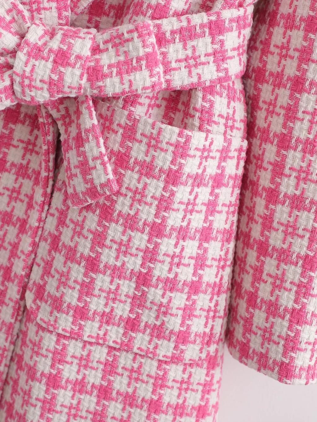 2022 秋冬女性ツイードジャケット Traf ベルト付き質感のチェック柄ウールコートパッチポケット生き抜くピンク レッド オータム 秋物 ウィンター 冬物 ハーネス bel81622976260 | aliel