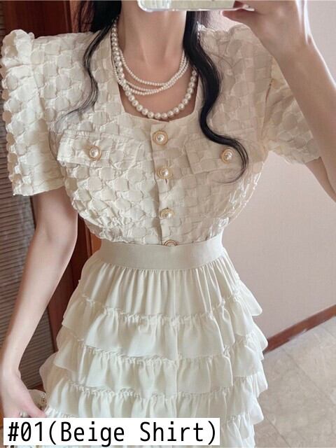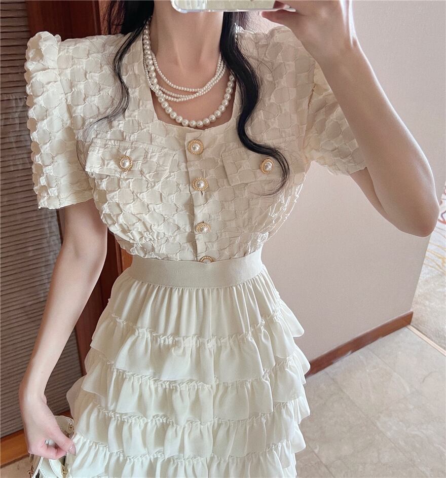 2022 スウィートスクエアカラー半袖シャツフリルケーキスカート弾性ウエスト 2 点セット夏の女性のスーツ ショート ハーフスリーブ エラスティック 伸縮 大人ガーリー キュート カジュアル サマー 夏物 スクウェア bel64511693103 | aliel