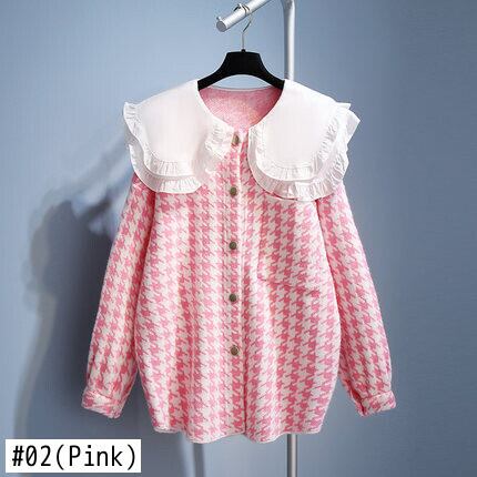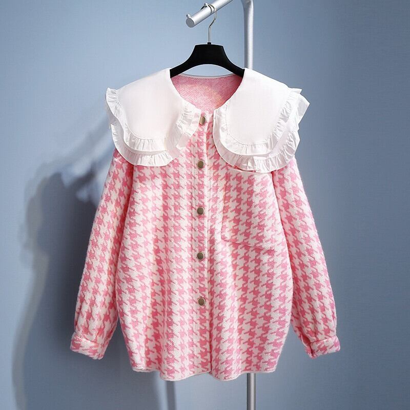 甘いピーターパンの襟のセーターのコートの女性 2021 秋冬チェック柄ニットカーディガン因果長袖ニットニットトップ ロング 大人ガーリー スウィート キュート カジュアル オータム 秋物 ウィンター 冬物 bel31103811736 | aliel