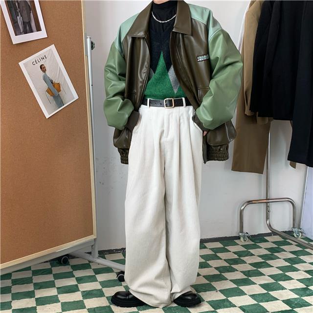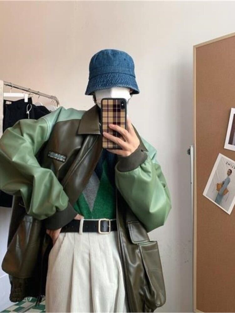 アメリカンレトロカラーコントラストレザージャケット2021秋冬新作トレンドブランドルーズジャケットステッチジャケット オータム 秋物 ウィンター 冬物 bel44489492340