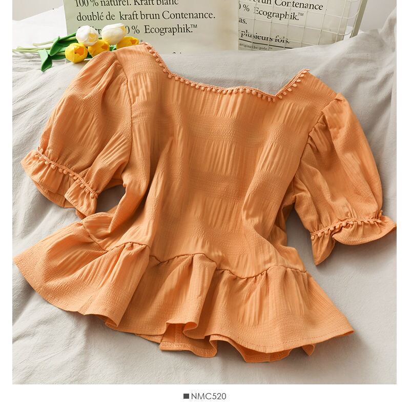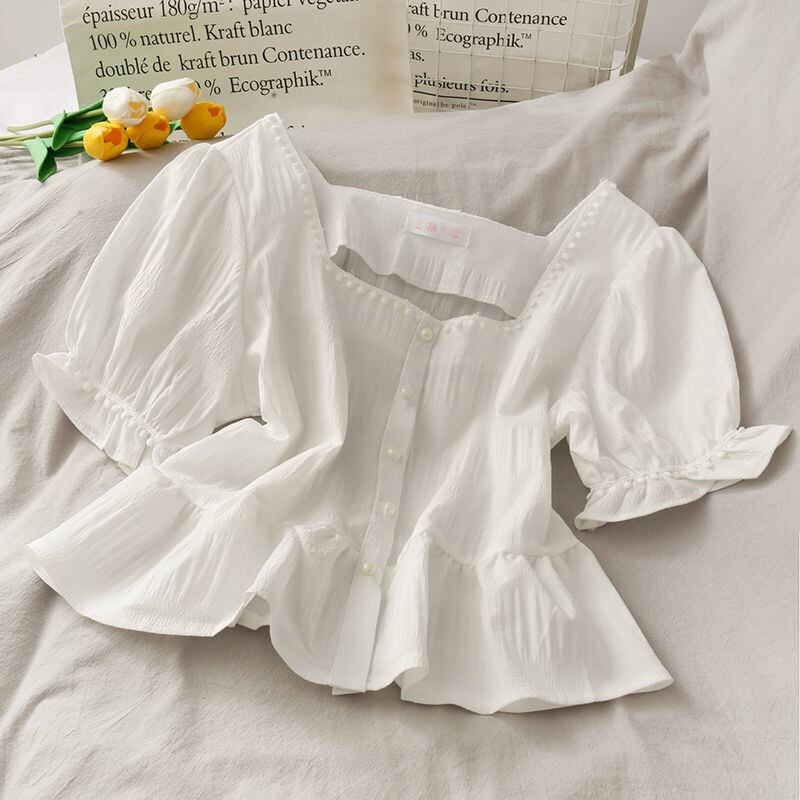 女性の夏のブラウス シフォン シャツ フリル スクエア カラー パール バックル ソリッド スリム トップス ラッフル サマー 夏物 真珠 ソリッドカラー スクウェア bel22973795191 | aliel