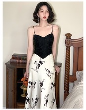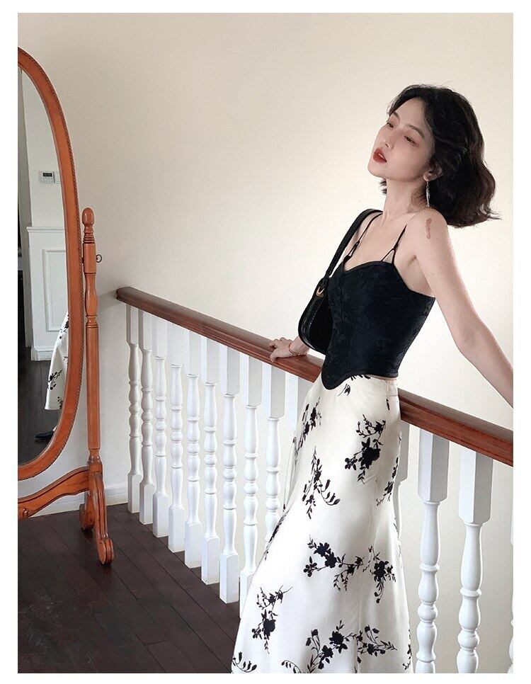 女性の夏のサテン 2 個セット フレンチ リーフ プリント スカート + セクシーな黒のタンク スーツ休日のオフィスの女性のビーチ セット ブラック サマー 夏物 会社 学校 通勤や通学にも bel68685251958 | aliel