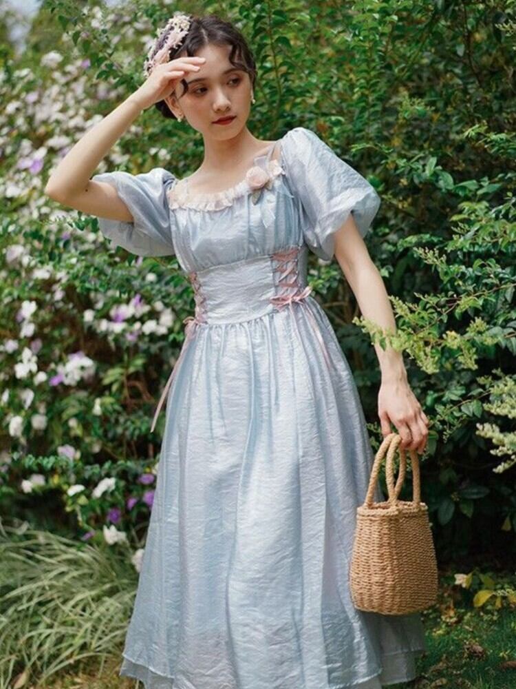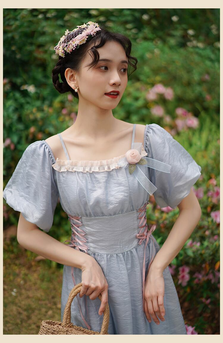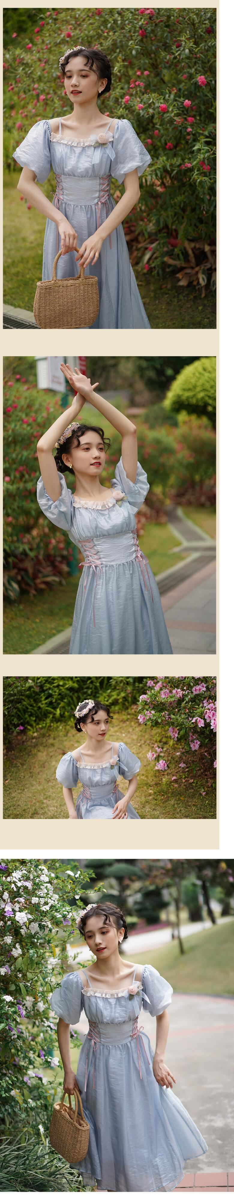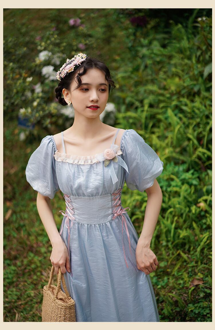 夏の森ガールスタイルコテージドレスシックなライトブルー包帯パフスリーブロマンチックな女性のドレスローブ Ete 大人ガーリー スウィート キュート カジュアル サマー 夏物 bel62589289150 | aliel