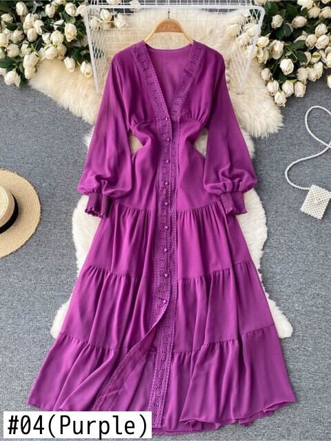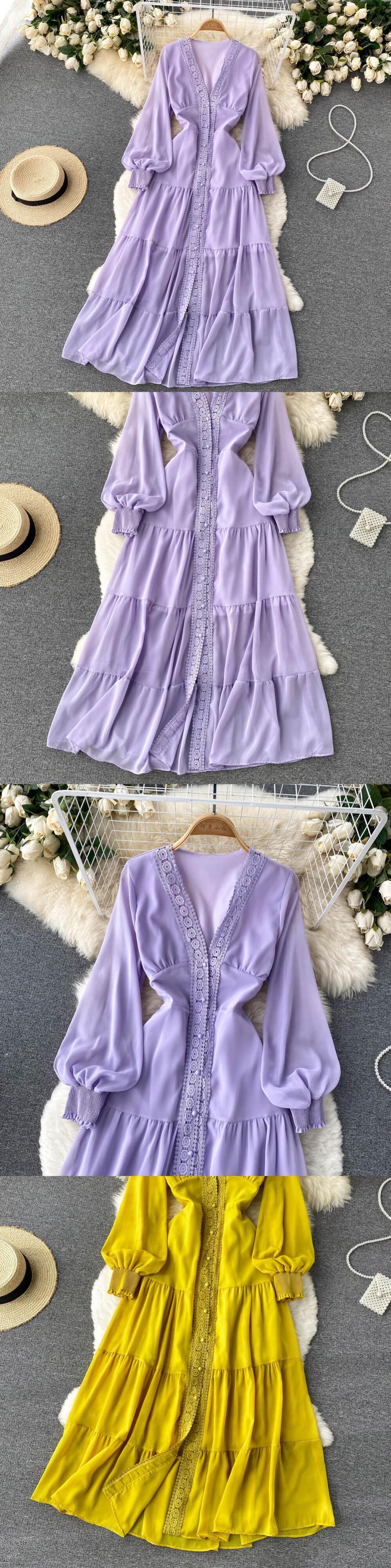 秋のフランスのレトロなレース V ネック Vestido 女性のウエスト痩身シングルブレストミディドレス休日自由奔放に生きるドレス オータム 秋物 Vネック bel57991446670 | aliel