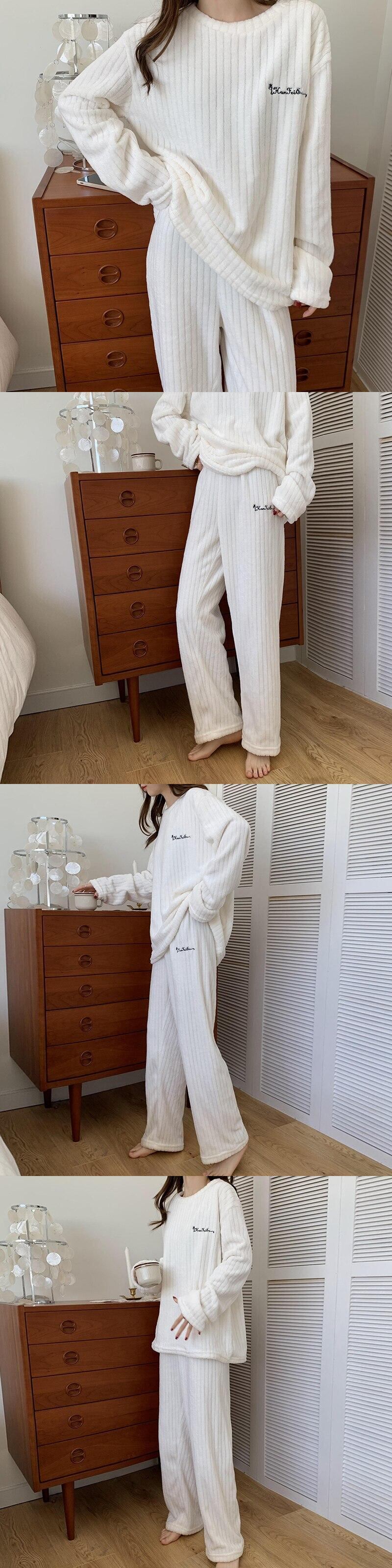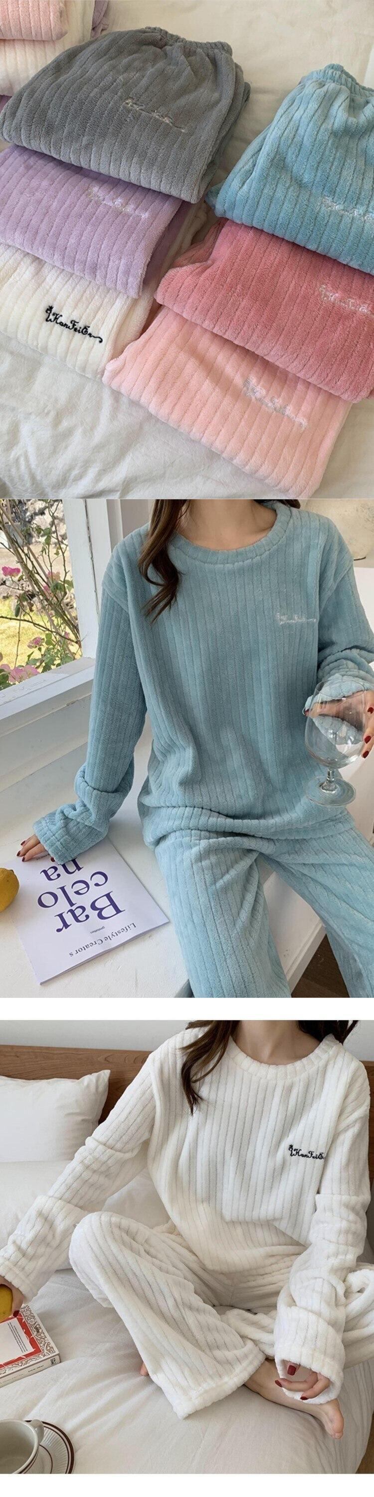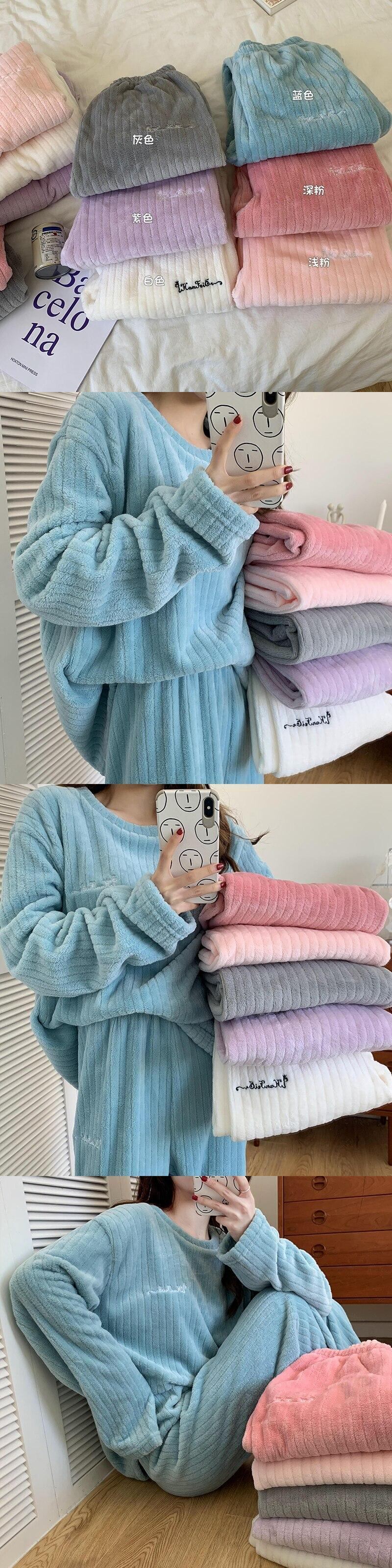 女性パジャマセットフランネルソリッドプラスベルベット厚いホームウェアオールマッチウォームデイリーベーシックスタイル弾性ウエスト エラスティック 伸縮 ソリッドカラー bel44998147365 | aliel