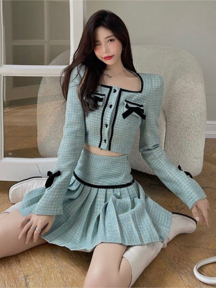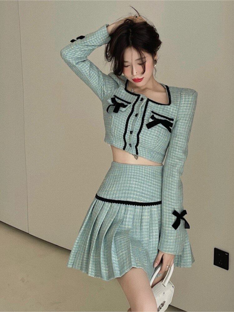 秋の女性のツーピースフレンチスクエアカラースモールフレグランスツイードボウショートコート+ Aラインプリーツミニスカートフェスティバル リボン オータム 秋物 スクウェア bel56948172472 | aliel