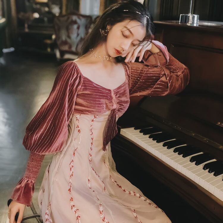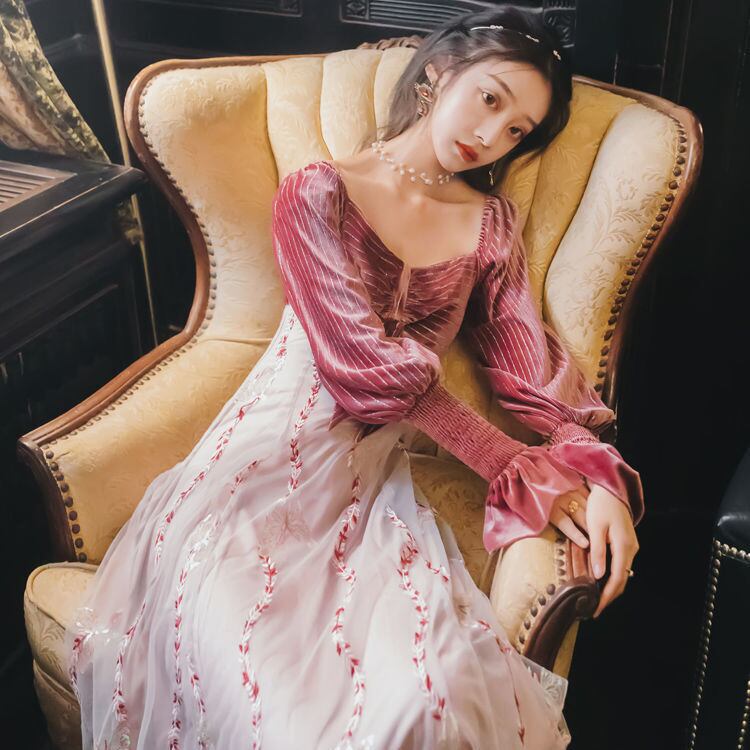 セクシーなスクエアカラーベルベットステッチ刺繍スパンコールバタフライ春秋メッシュシックなパーティードレス レッド スプリング 春物 オータム 秋物 スクウェア bel67350037803 | aliel