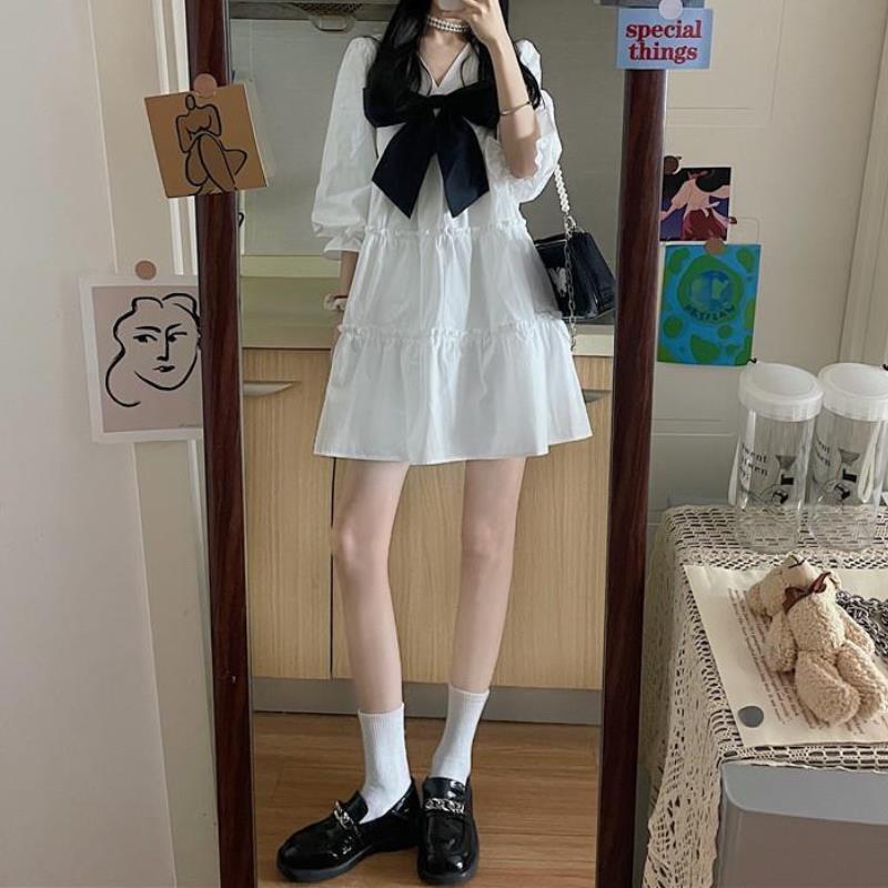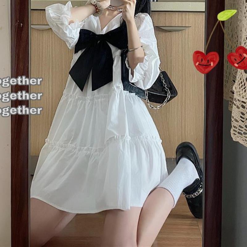 夏プレッピースタイルかわいい原宿衣装特大ストリート白いドレスの女性の弓ミニドレスロリータ vestidos ホワイト リボン 大人ガーリー スウィート キュート カジュアル サマー 夏物 bel87576700972 | aliel
