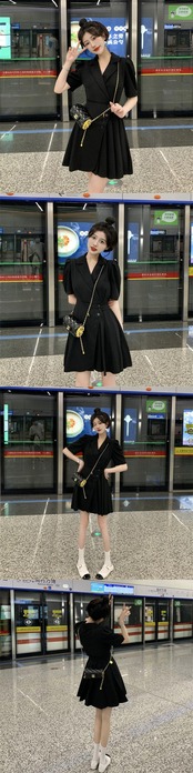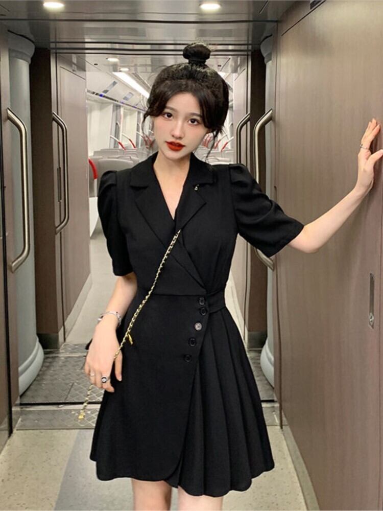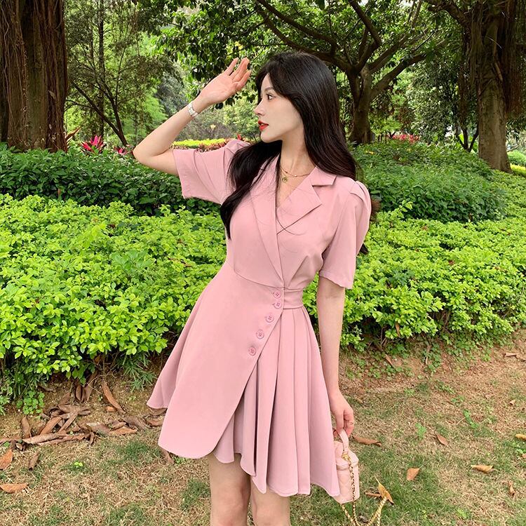 2022 夏半袖プリーツドレス女性ノッチソリッドオフィスレディフレンチ A ライン Vestidos ショート ハーフスリーブ サマー 夏物 Aライン ソリッドカラー 会社 学校 通勤や通学にも bel8154717363 | aliel