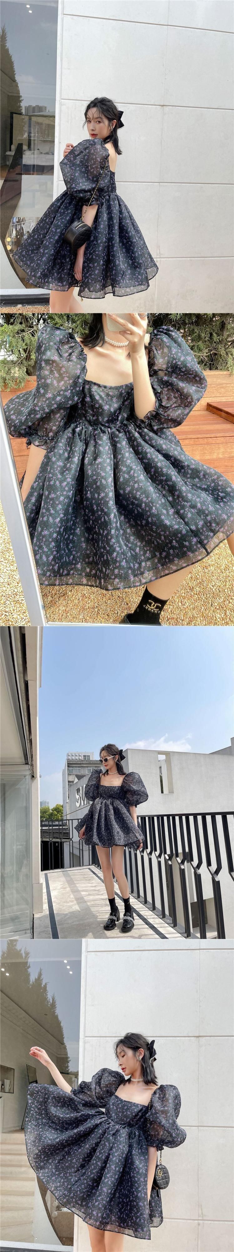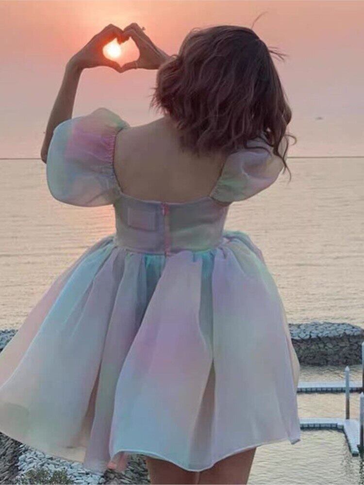 フレンチコート風スーパーフェアリーレインボーカラースイートスクエアネックパフスリーブふんわりドレスオーガンジーミニプリンセスドレス 大人ガーリー スウィート キュート カジュアル ふわふわ スクウェア bel18592668505 | aliel