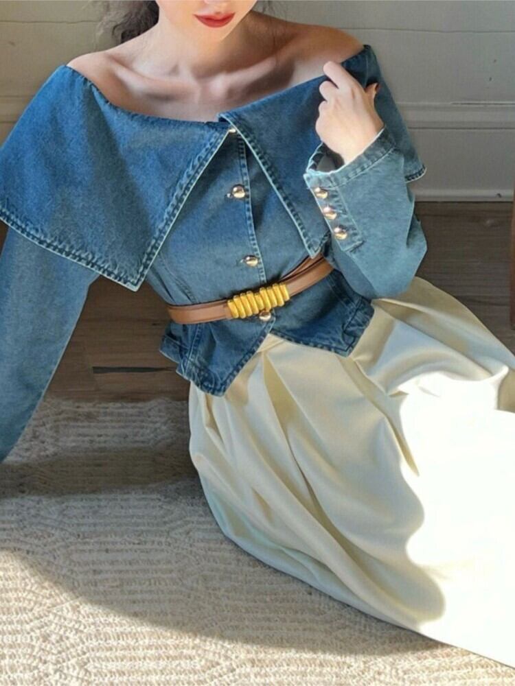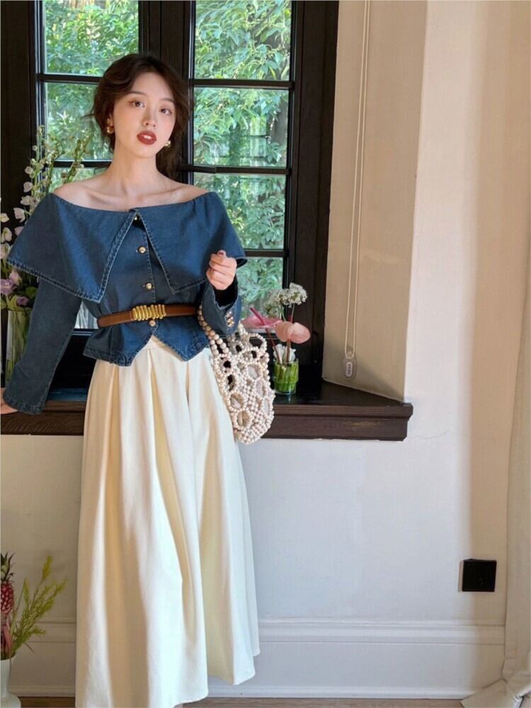 秋二枚セット女性長袖オフショルダー徳民ショートブラウス + ガーゼ A ラインスカートオフィススーツ ロング オータム 秋物 Aライン 会社 学校 通勤や通学にも bel38953062766 | aliel
