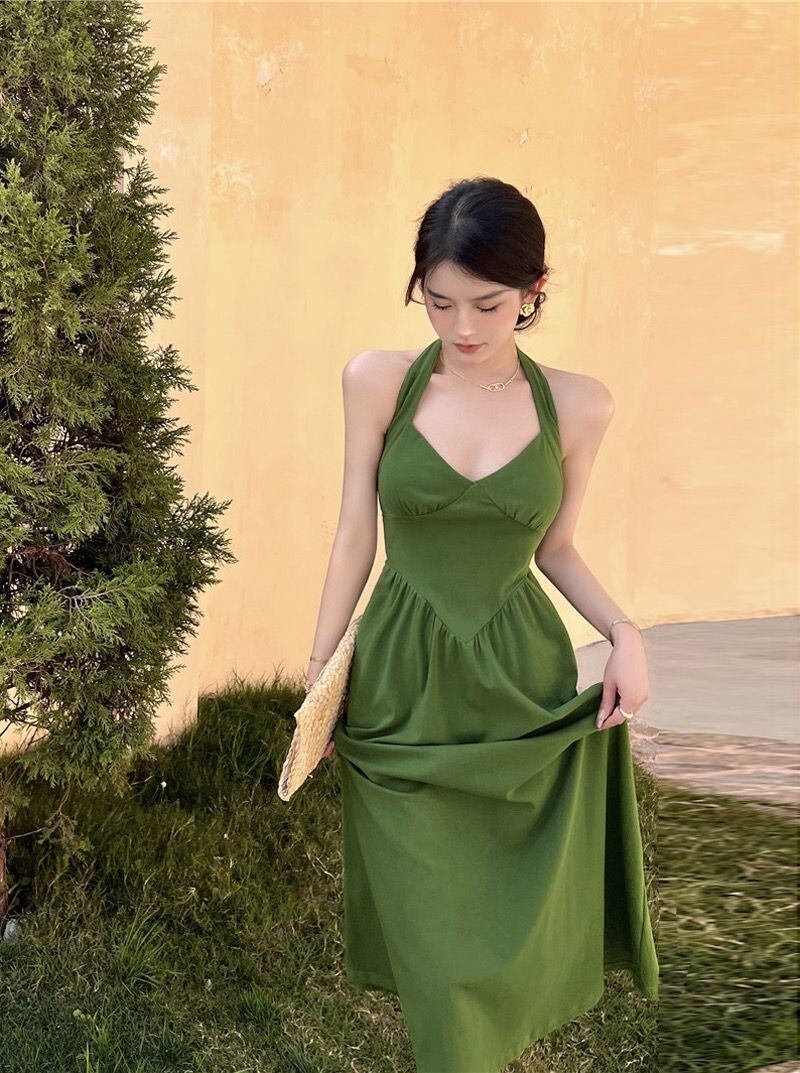 グリーン ロング ウエスト クロージング シン ホルター ネック ドレス女性のビッグ スイング フレンチ レトロ夏フェミニン Vestido サマー 夏物 bel63620607322 | aliel