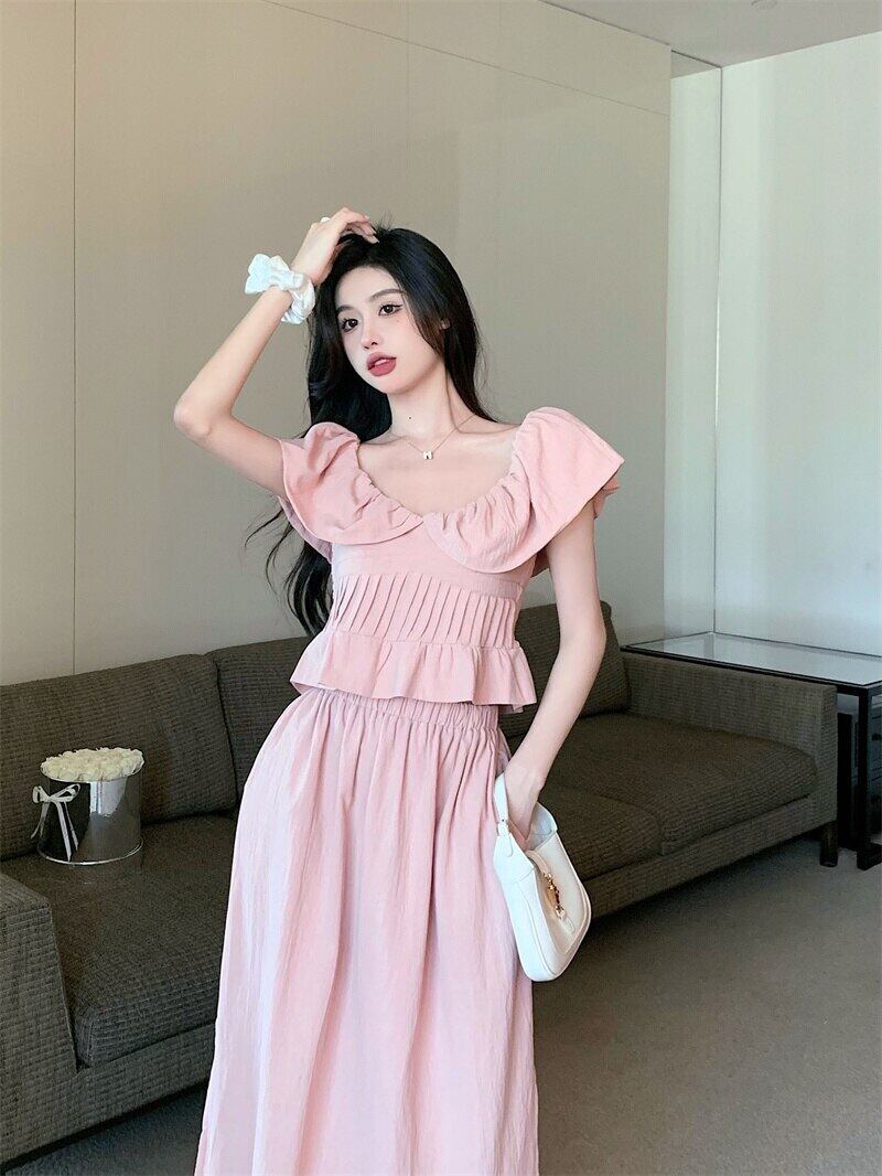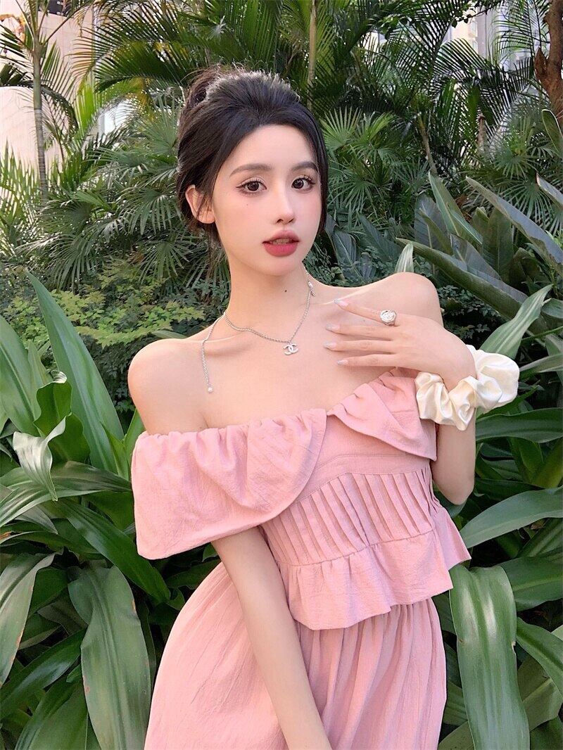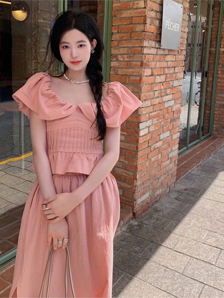 夏甘い優しいロマンチックなフレンチツーピーススーツ女性のセクシーなオフショルダーピンクトップ + スプリットスカートスーツ Y2k セット 大人ガーリー スウィート キュート カジュアル サマー 夏物 bel36243507675 | aliel