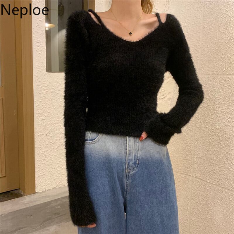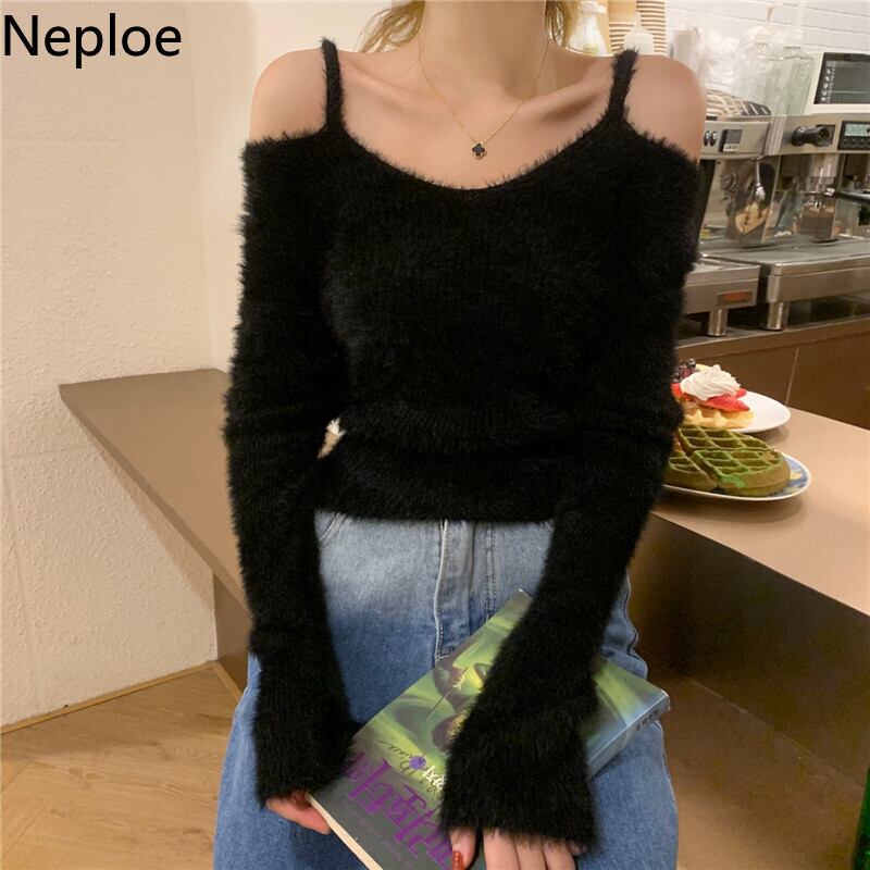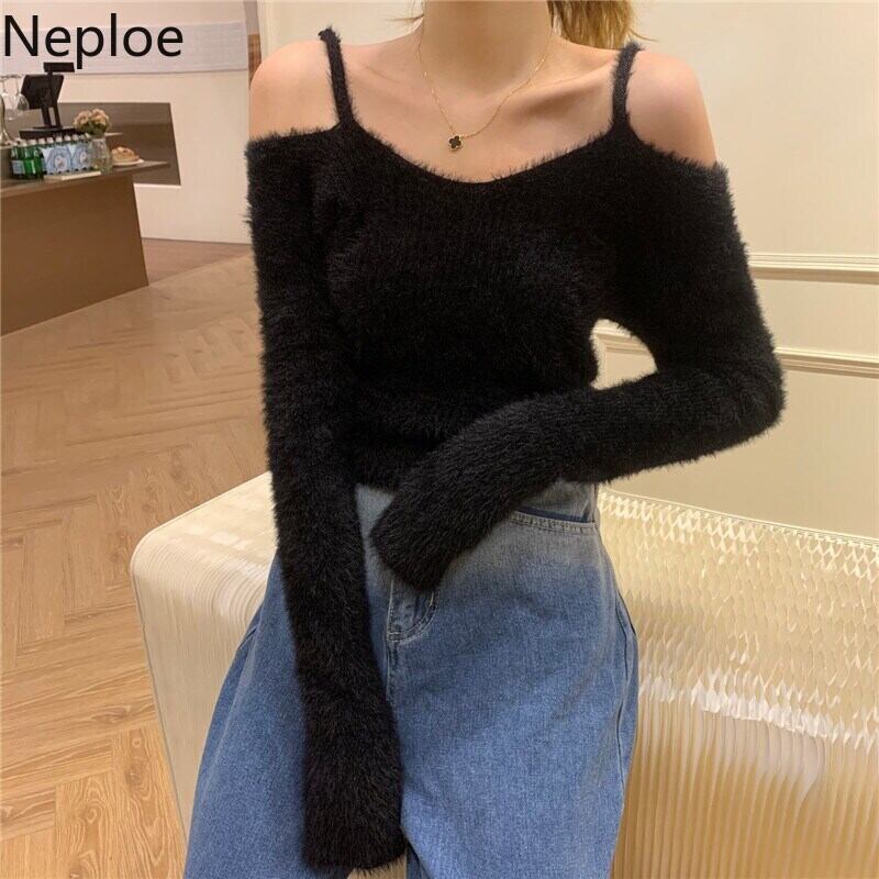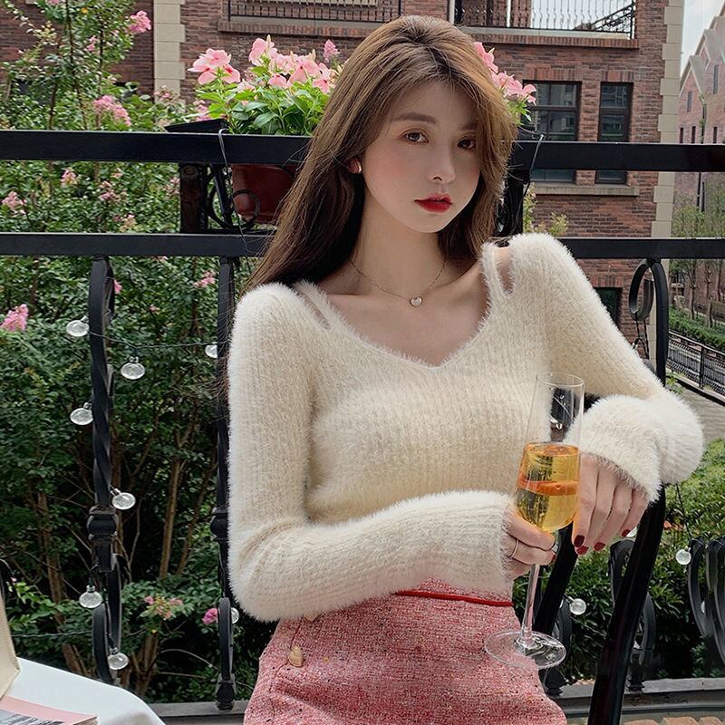 セクシーなフェイクミンクオフショルダーセーター女性の長袖スリムフィットニットショートプルオーバー冬のシックなスリムフィットプルオーバー ロング ウィンター 冬物 ファー bel84851041973 | aliel