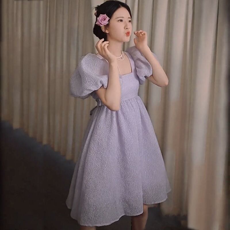 女性パープルドレス 2021 夏フレンチスウィートフェアリー V ネックウエストパフスリーブパーティードレス 大人ガーリー キュート カジュアル サマー 夏物 Vネック bel89291419000 | aliel