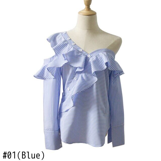 Bella Philosophy 春夏イレギュラー オフショルダー フリル 長袖 ストライプ レディース ブラウス シャツ ブルー ホワイト ロング ラッフル スプリング 春物 サマー 夏物 bel91542823871 | aliel