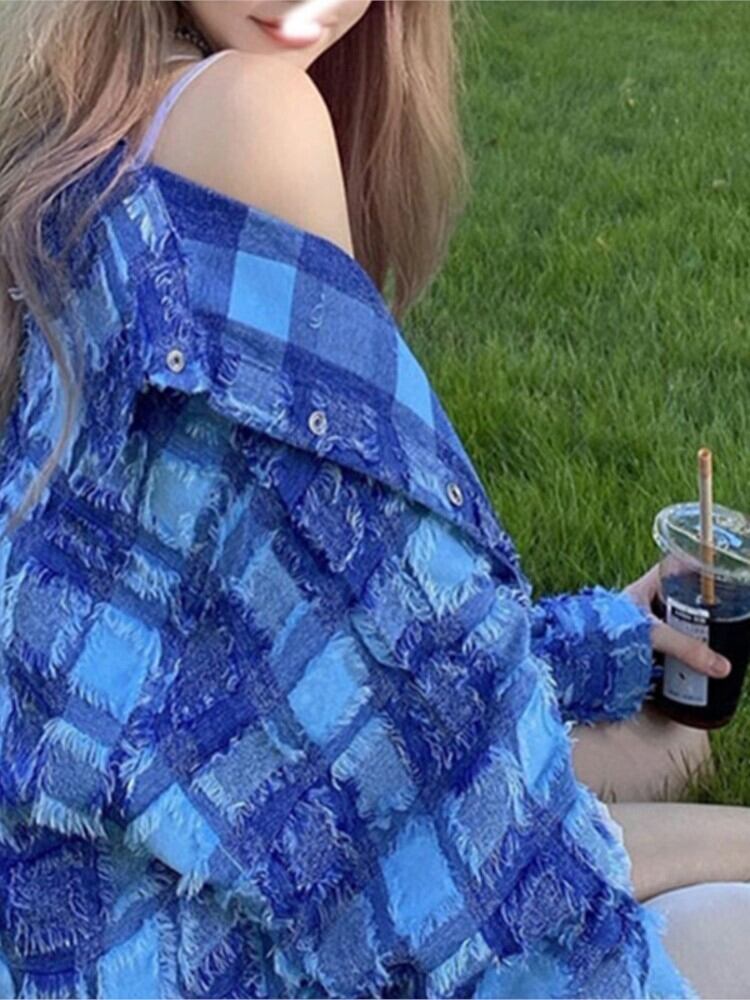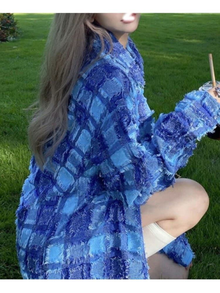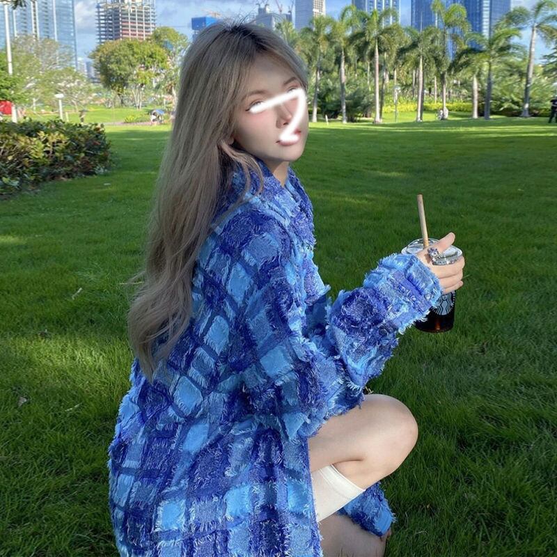 甘くて新鮮なブルーのデザインの格子縞のジャケットの女性 2022 新しい春と秋緩いオールマッチ長袖韓国のコートの女性 ロング 大人ガーリー スウィート キュート カジュアル スプリング 春物 オータム 秋物 bel85804772944 | aliel