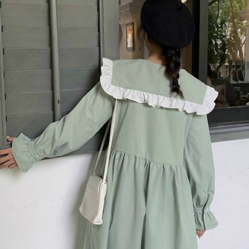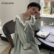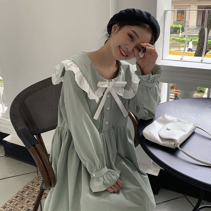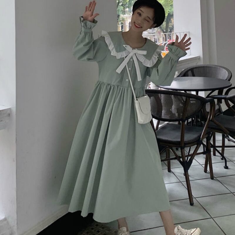 甘い学生長袖ボタンドレス女性パッチワークピーターパン襟オル弓 A ライン緩い固体 Vestidos ロング リボン 大人ガーリー スウィート キュート カジュアル Aライン ソリッドカラー bel85358297247 | aliel