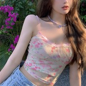ストリートフラワープリントメッシュトップ女性キャミソール V ネックレースパッチワークセクシーなトップスストラップパーティー夏クロップトップキャミソールホット サマー 夏物 Vネック フラワーデザイン bel77703434894 | aliel