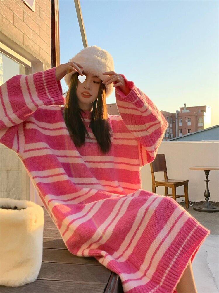 ストライプセーターワンピース 2022年秋冬バージョン 新作 怠惰なスタイル オーバーニーロング ゆったりニット 長袖ワンピース オータム 秋物 ウィンター 冬物 bel28499000578
