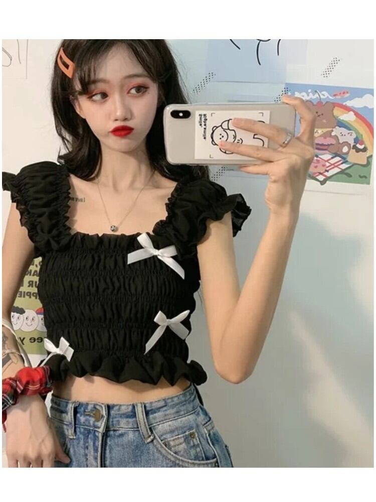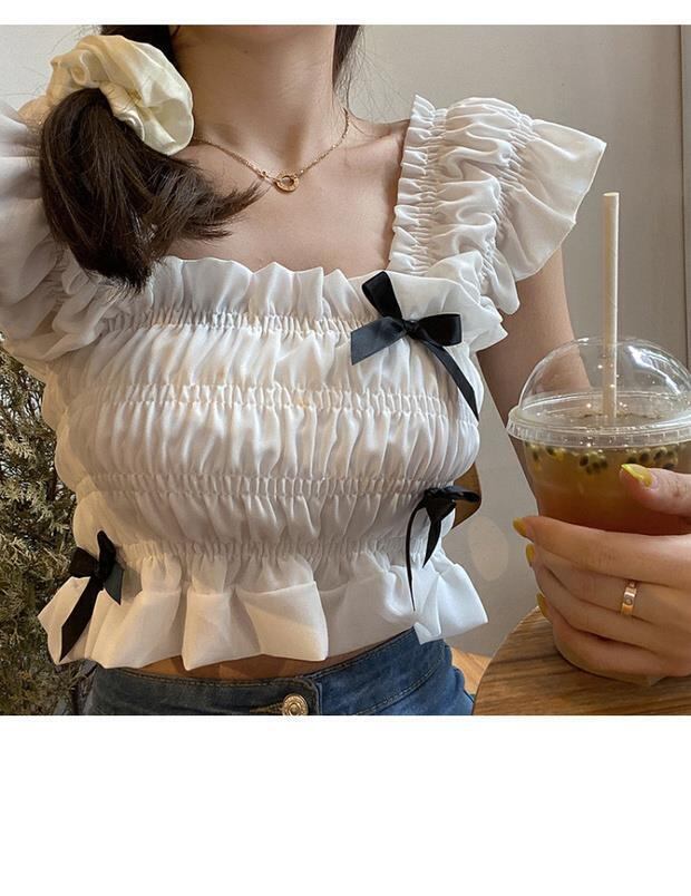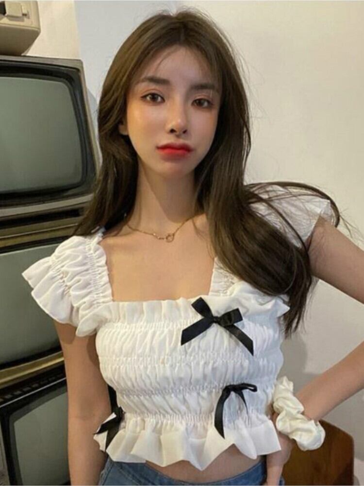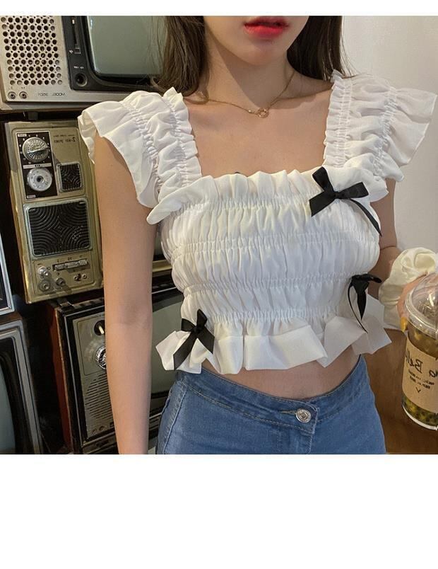 女性ソフト弓クロップ固体学生セクシーな甘いスリムな夏白スタイルのシックなキャミソールかわいいトップス ホワイト リボン 大人ガーリー スウィート キュート カジュアル サマー 夏物 ソリッドカラー bel18508712193 | aliel