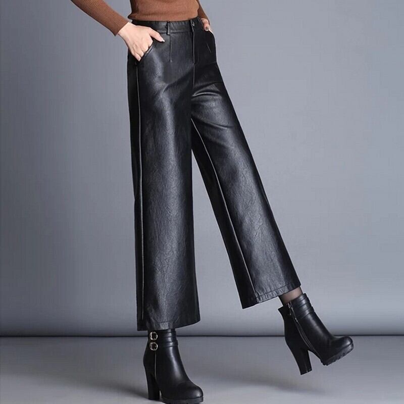 ベラ哲学 2022 秋冬 Pu レザーレディースワイドレッグパンツ女性黒弾性ボトムスルーズポイントズボン ブラック エラスティック 伸縮 オータム 秋物 ウィンター 冬物 ワイドパンツ bel75574068409 | aliel