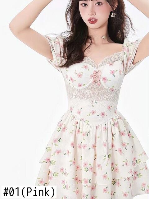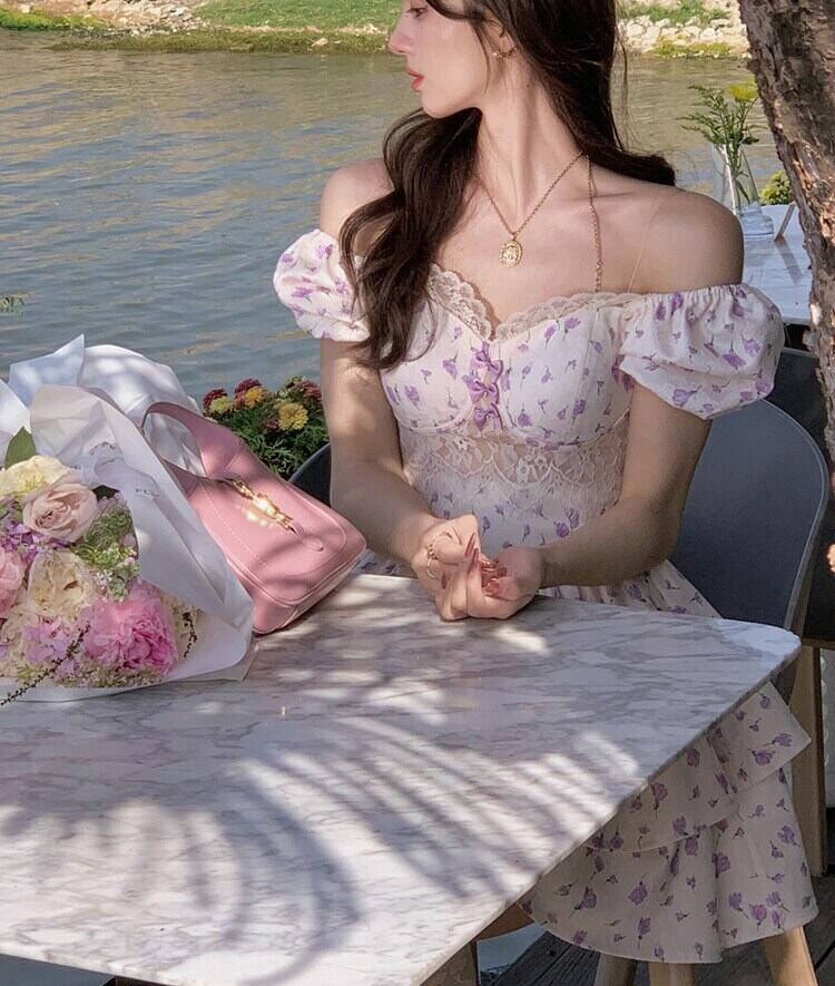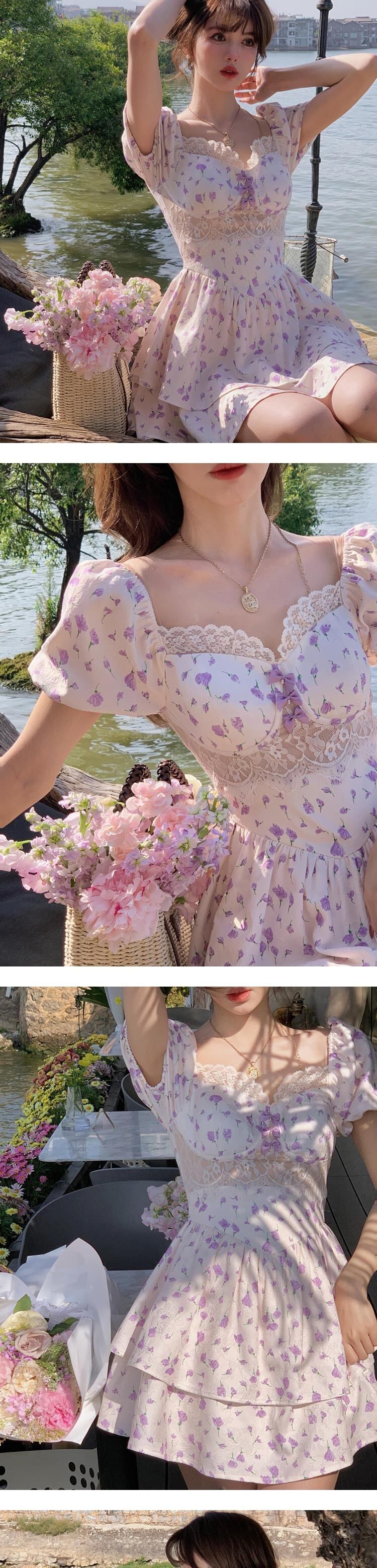 夏の花ドレス女性パープルフランスパーティーミニドレスレースプリント甘いかわいい妖精ドレス 大人ガーリー スウィート キュート カジュアル サマー 夏物 花柄 bel18382974584 | aliel
