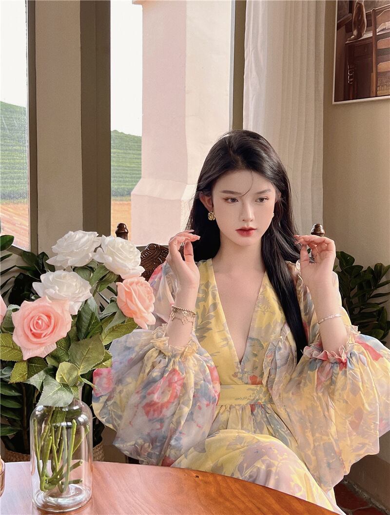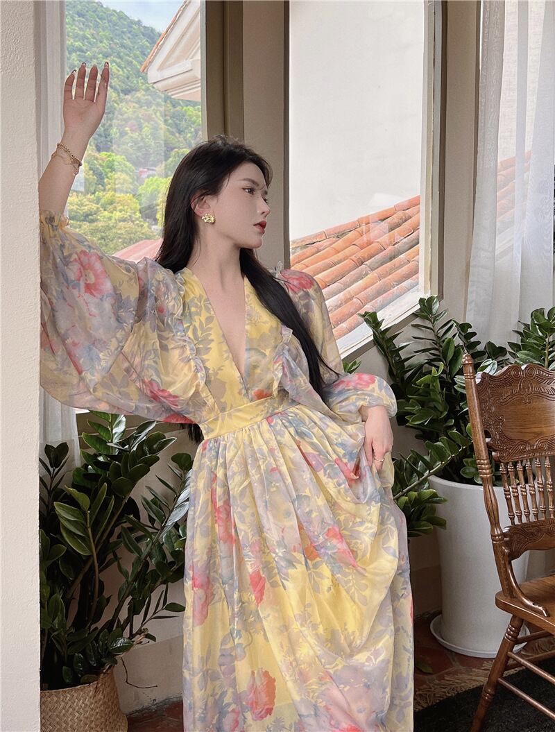 女性のフレンチホリデーサマープリント自由奔放に生きるロングマキシドレスウエストタイ V ネックシフォンビーチパーティーナイトドレス Traf ローブ 夏物 Vネック bel67685116053 | aliel