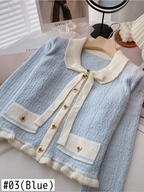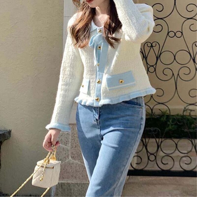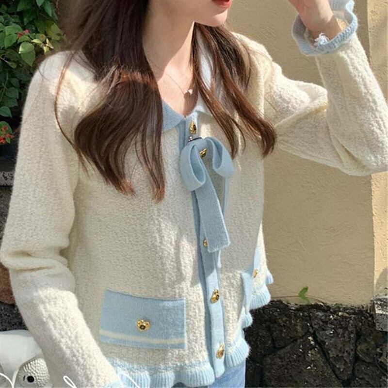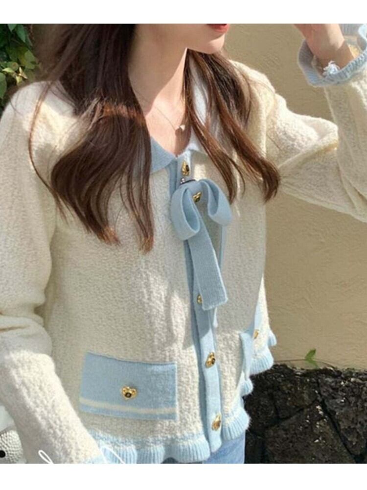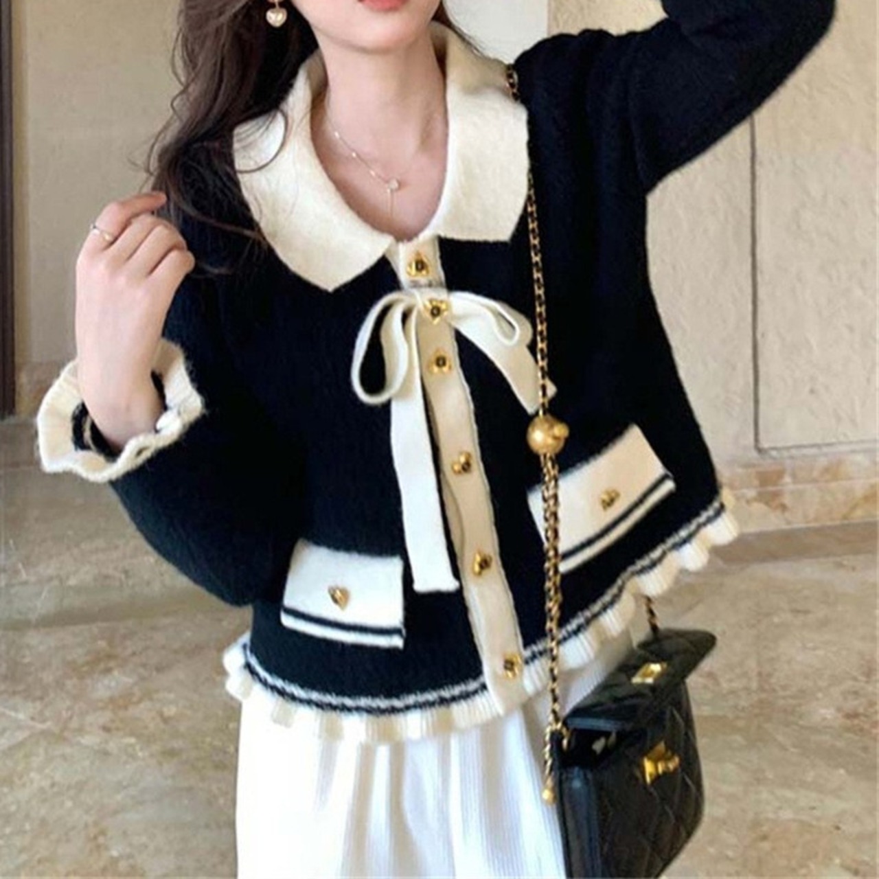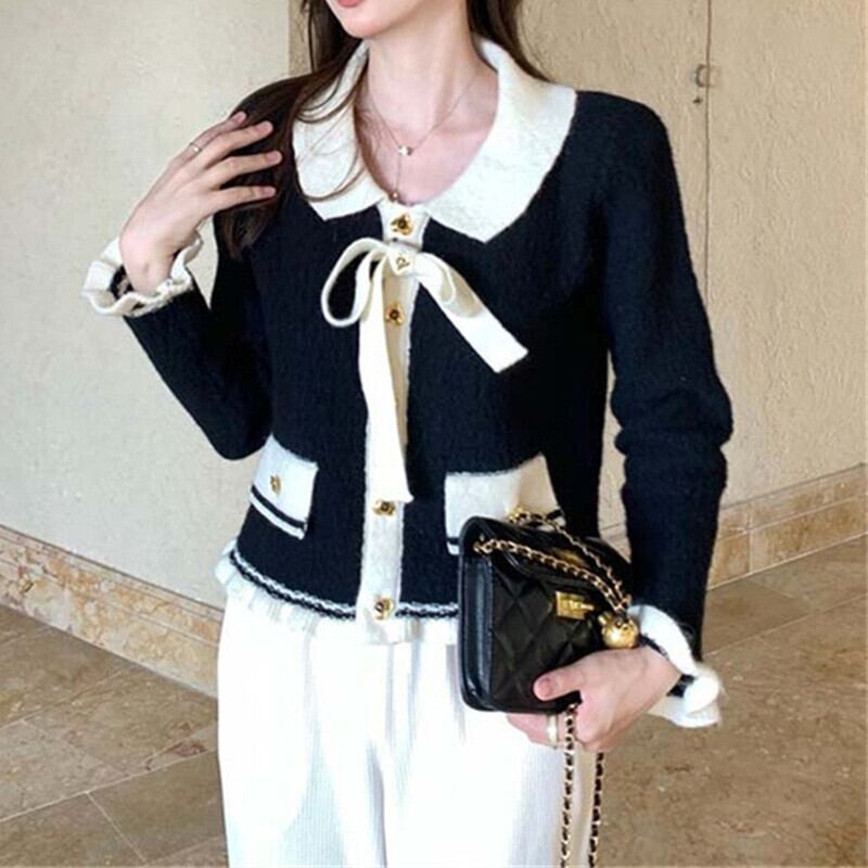女性の黒クロップドカーディガンスリムレトロジャンパー弓甘い優しい 2022 春の女性セーターニットジャケット服 ブラック リボン 大人ガーリー スウィート キュート カジュアル スプリング 春物 bel25718014998 | aliel
