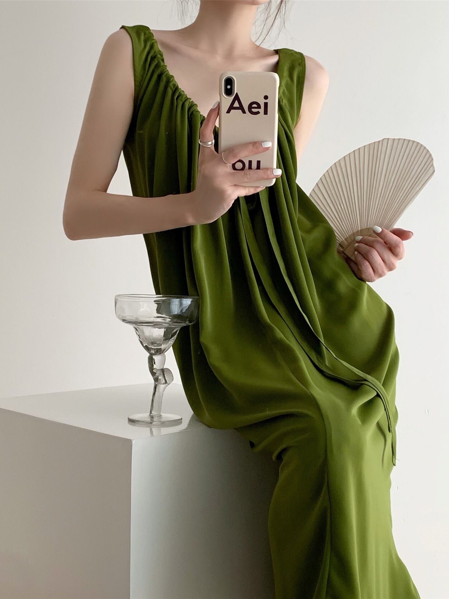夏のノースリーブの女性のドレス 2022 シンプルな O ネック無地ルーズポケット調節可能なオフィスグリーンドレス サマー 夏物 アジャスタブル Oネック ソリッドカラー 会社 学校 通勤や通学にも bel5430960415 | aliel