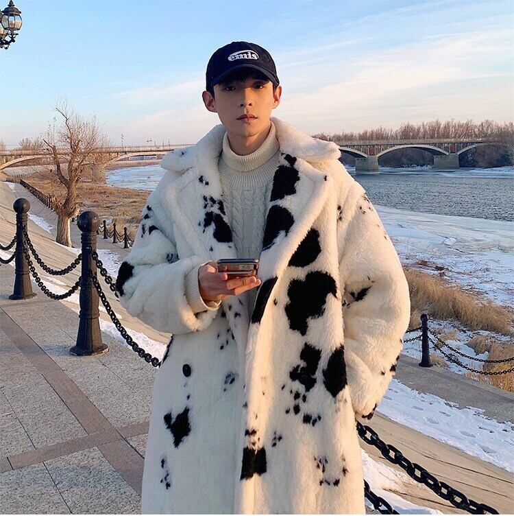 女性と男性ユニセックス冬暖かいウール フェイクファー コート シープ ウール コート ルーズ ロング カウ プリント ファッション カジュアル ウインドブレーカー ウィンター 冬物 bel78079576010 | aliel