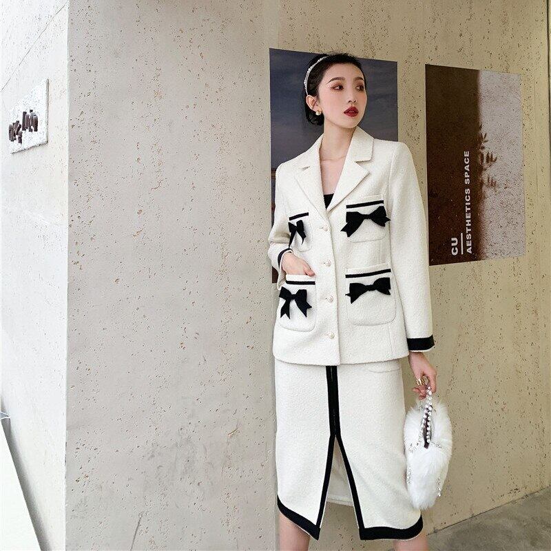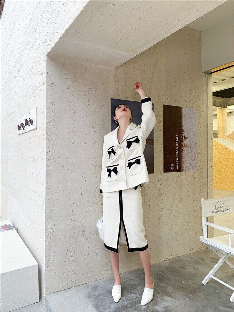 甘いツーピースセット女性 2021 春黒、白のコントラストステッチ弓ブレザージャケット + スカートスーツ ホワイト ブラック リボン 大人ガーリー スウィート キュート カジュアル スプリング 春物 bel70514767893 | aliel