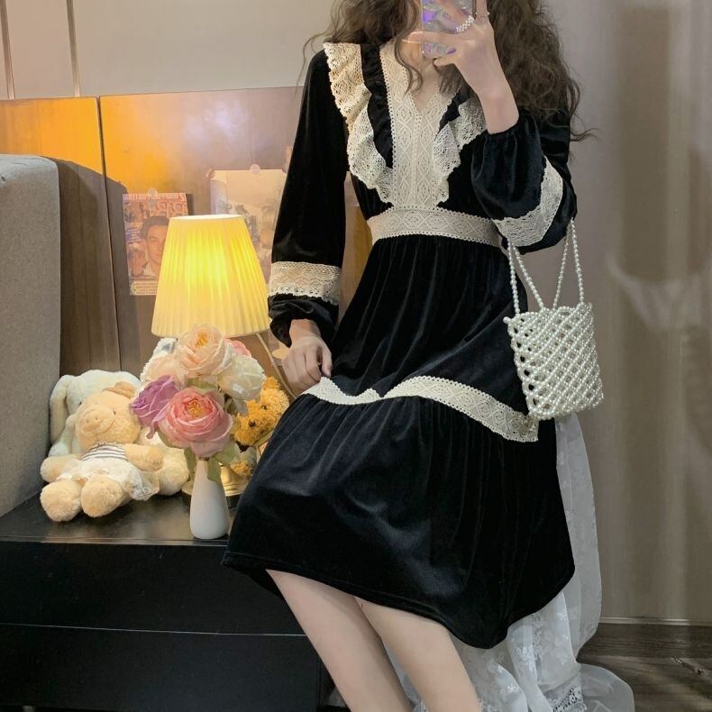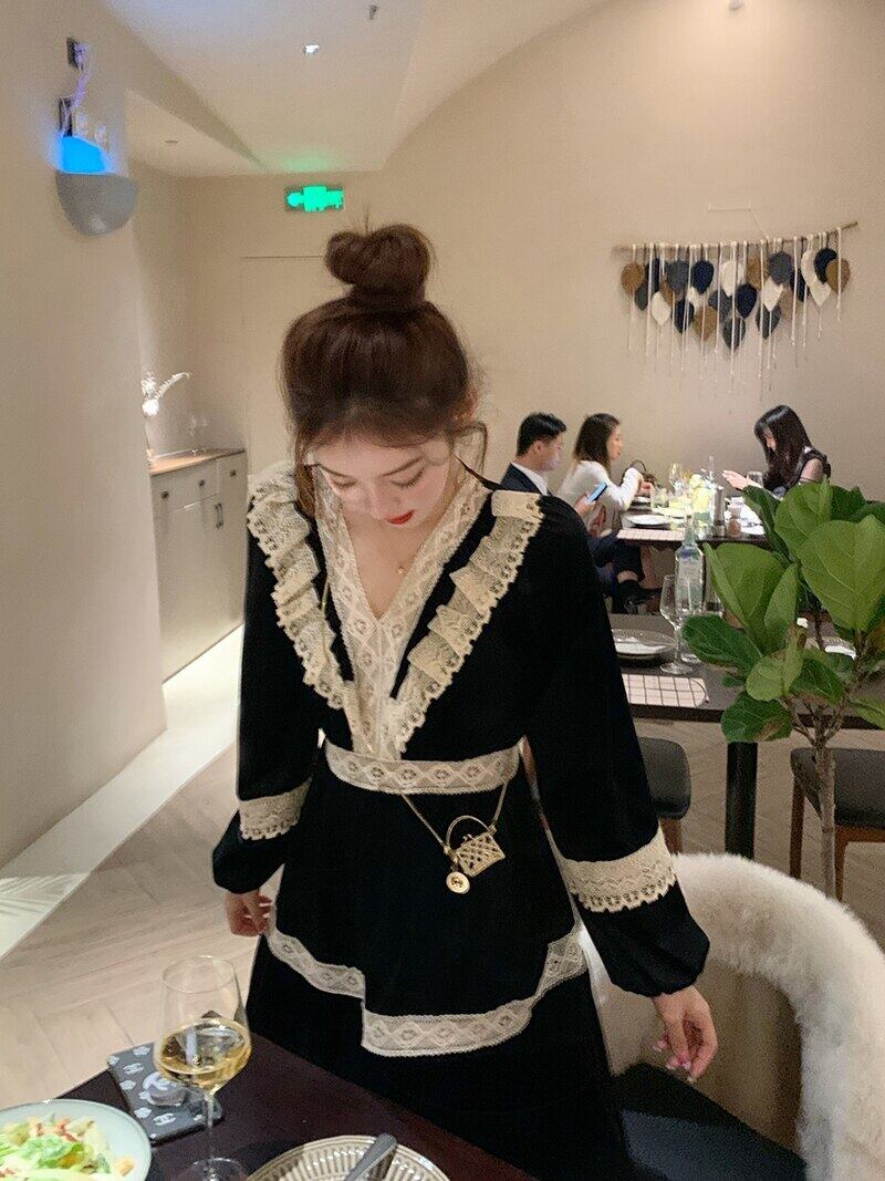 春フレンチ ブラック ベルベット フリル ドレス宮殿ミディ ドレス vestidos 가을 원피스 한국 ropa mujer レース ラッフル スプリング 春物 bel84406116148 | aliel