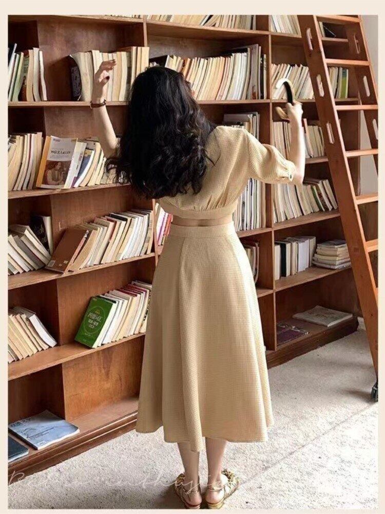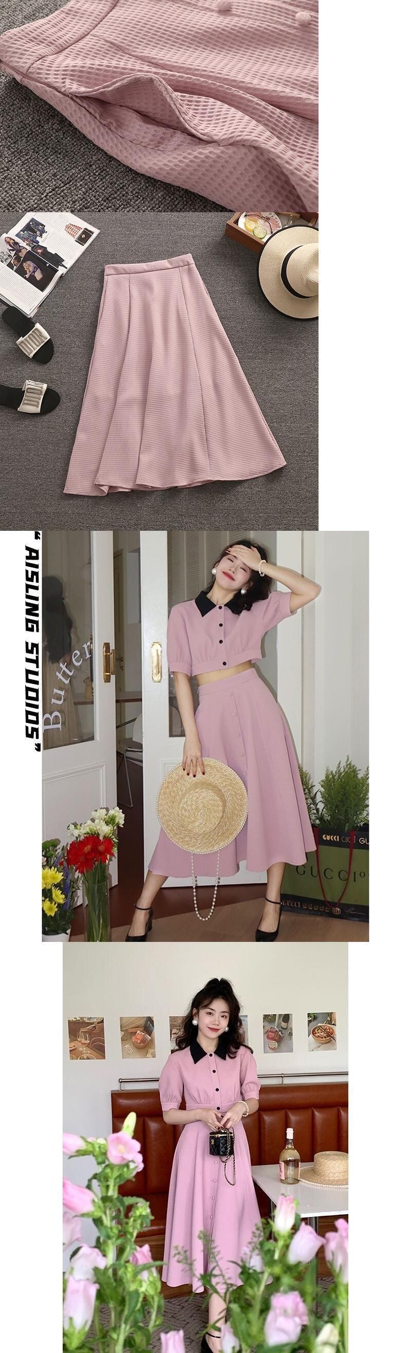 レトロ ワッフル ツー ピース セット女性スウィート パフ スリーブ ショート シャツ + ウエスト シングル ブレスト ミディ スカート スーツ 2 ピース セット 大人ガーリー キュート カジュアル bel9104842938 | aliel