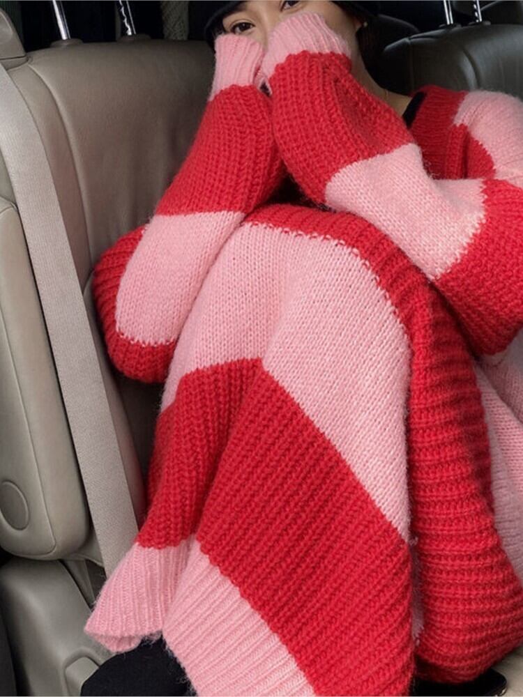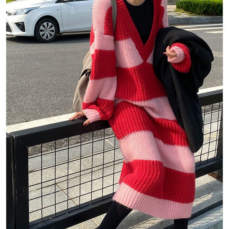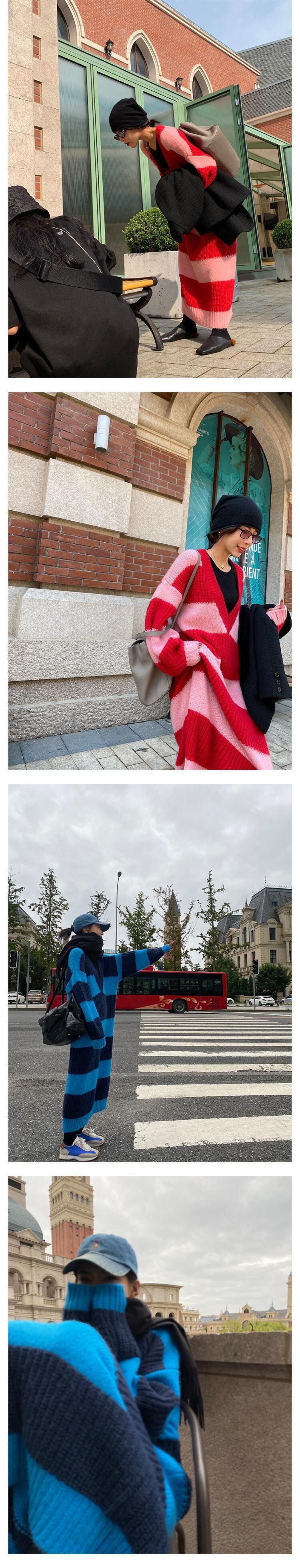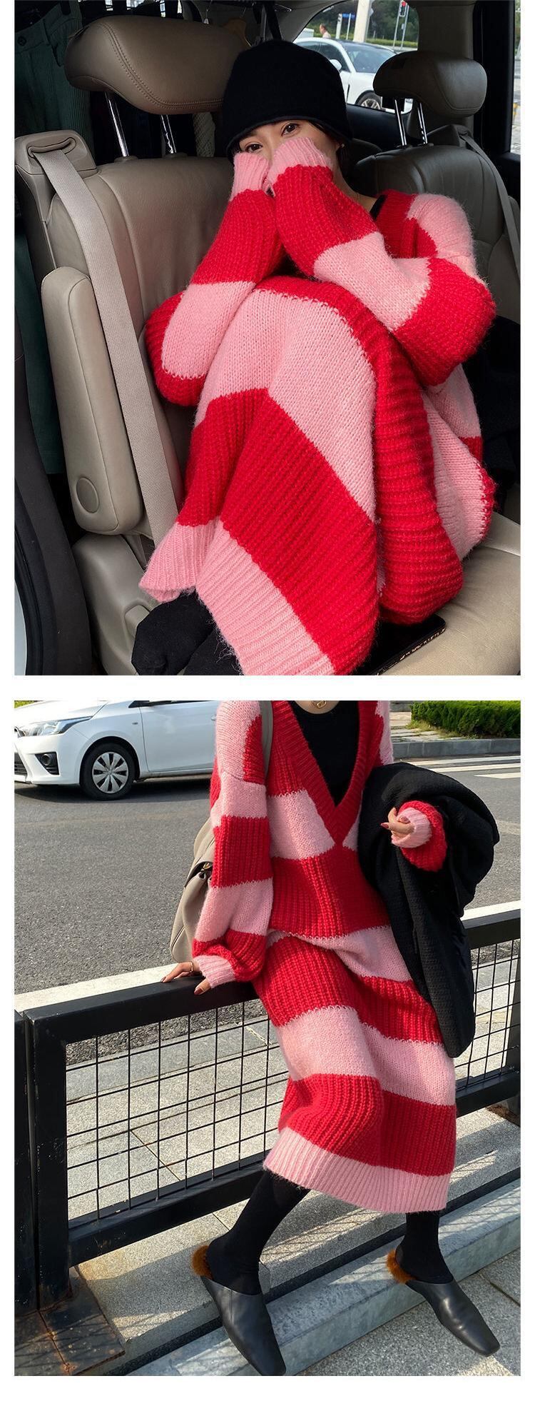 怠惰な風 V ネック ドレス厚くストライプ ニット秋と冬の女性の緩い肉カバー コントラスト カラー セーター ロング ドレス オータム 秋物 ウィンター 冬物 Vネック bel61001540697