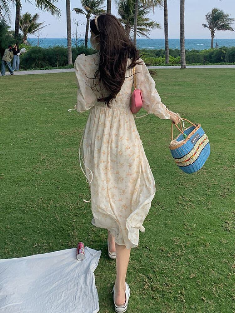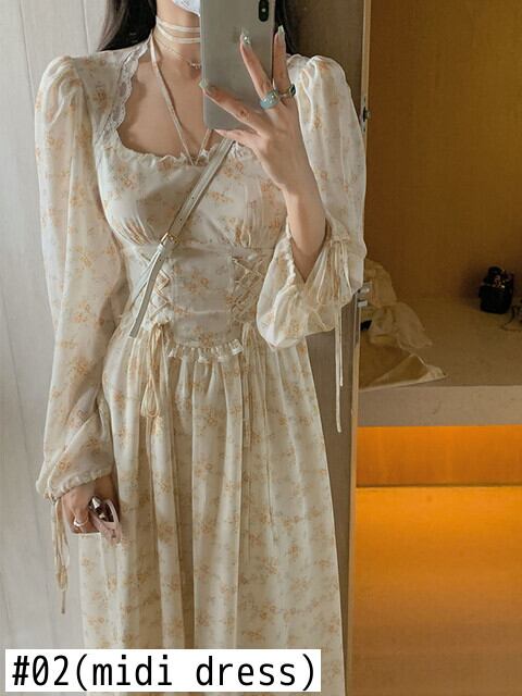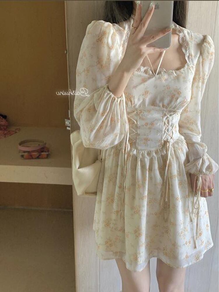 フローラルレース自由奔放に生きるドレス森ガールスタイルパフスリーブ包帯妖精ミニショートドレス女性 2022 大人ガーリー スウィート キュート カジュアル 花柄 bel99866589708