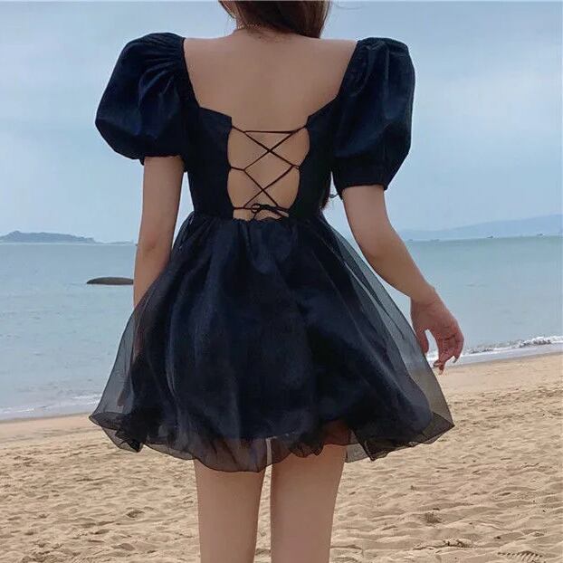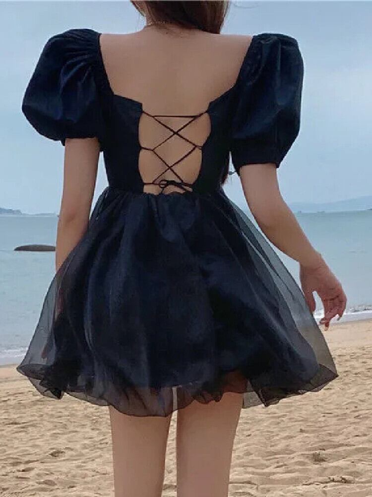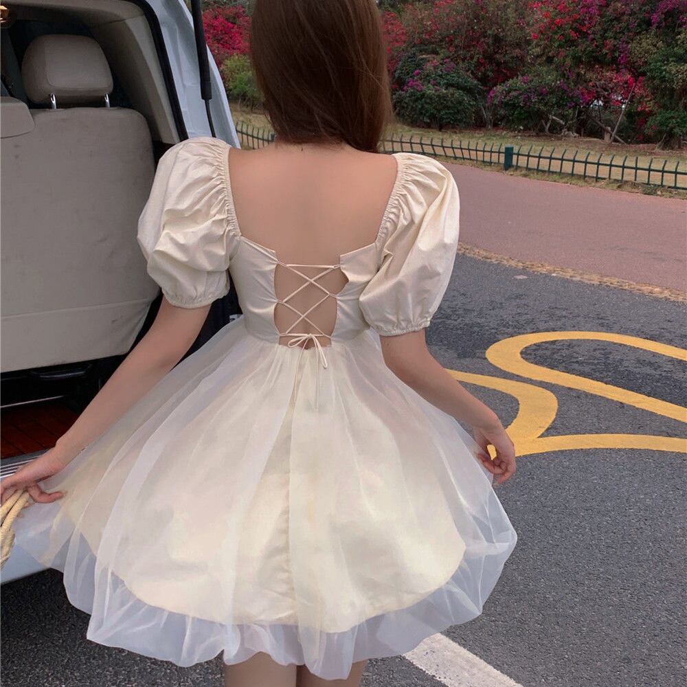バック包帯ドレス夏ハイウエスト背中の開いたバブル スリーブ プリンセス スカート一言ふわふわvestido de mujer セクシー ドレス ハイウェスト サマー 夏物 bel68326569428 | aliel