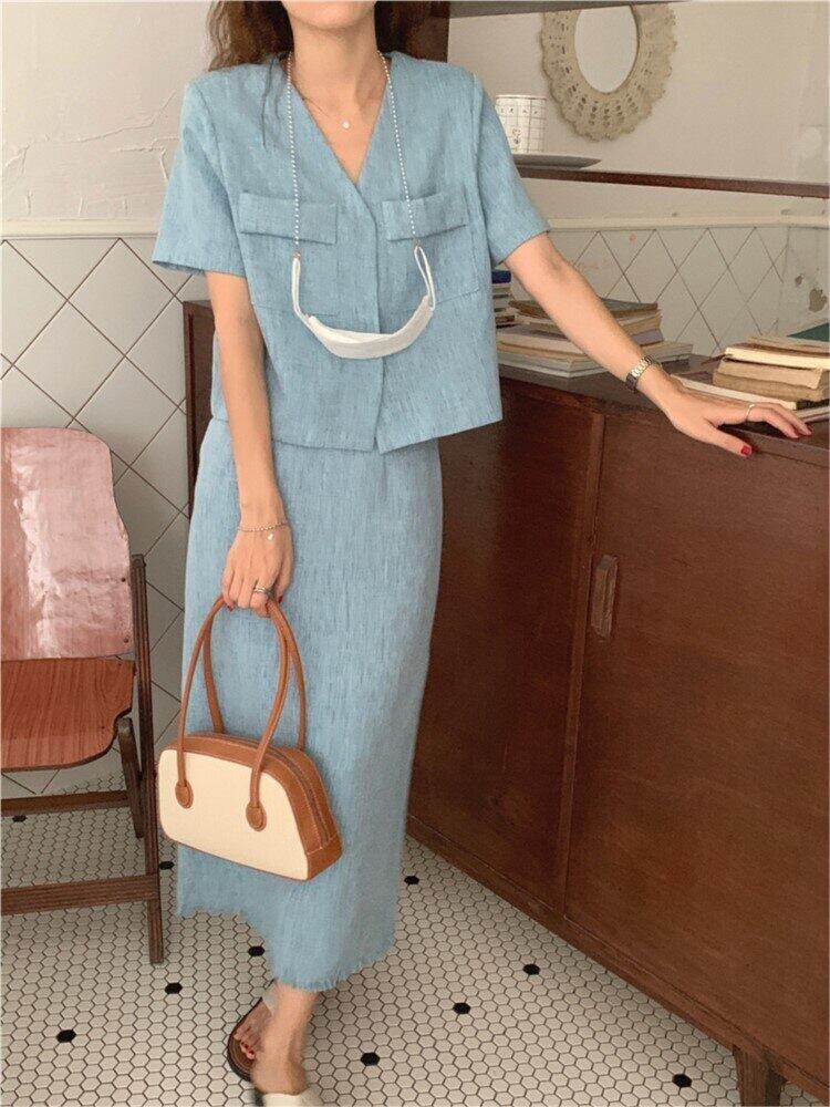 ブルー夏の女性のツーピーススーツ半袖ブレザースーツ 2022 事務服 OL ウエストスプリットミディスカートセット ショート ハーフスリーブ サマー 夏物 会社 学校 通勤や通学にも bel79656314769 | aliel