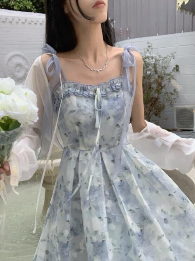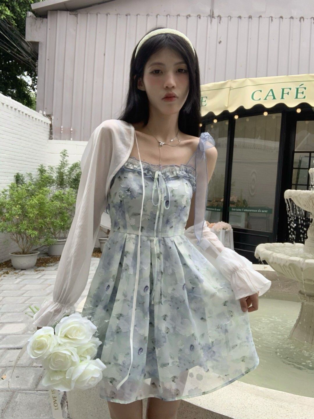 花柄キャミソール女性の夏のセクシーな甘いストラップレスショートドレス長袖ブラウス 2 点セット女性 traf платье robe ロング 大人ガーリー スウィート キュート カジュアル サマー 夏物 bel47054170118